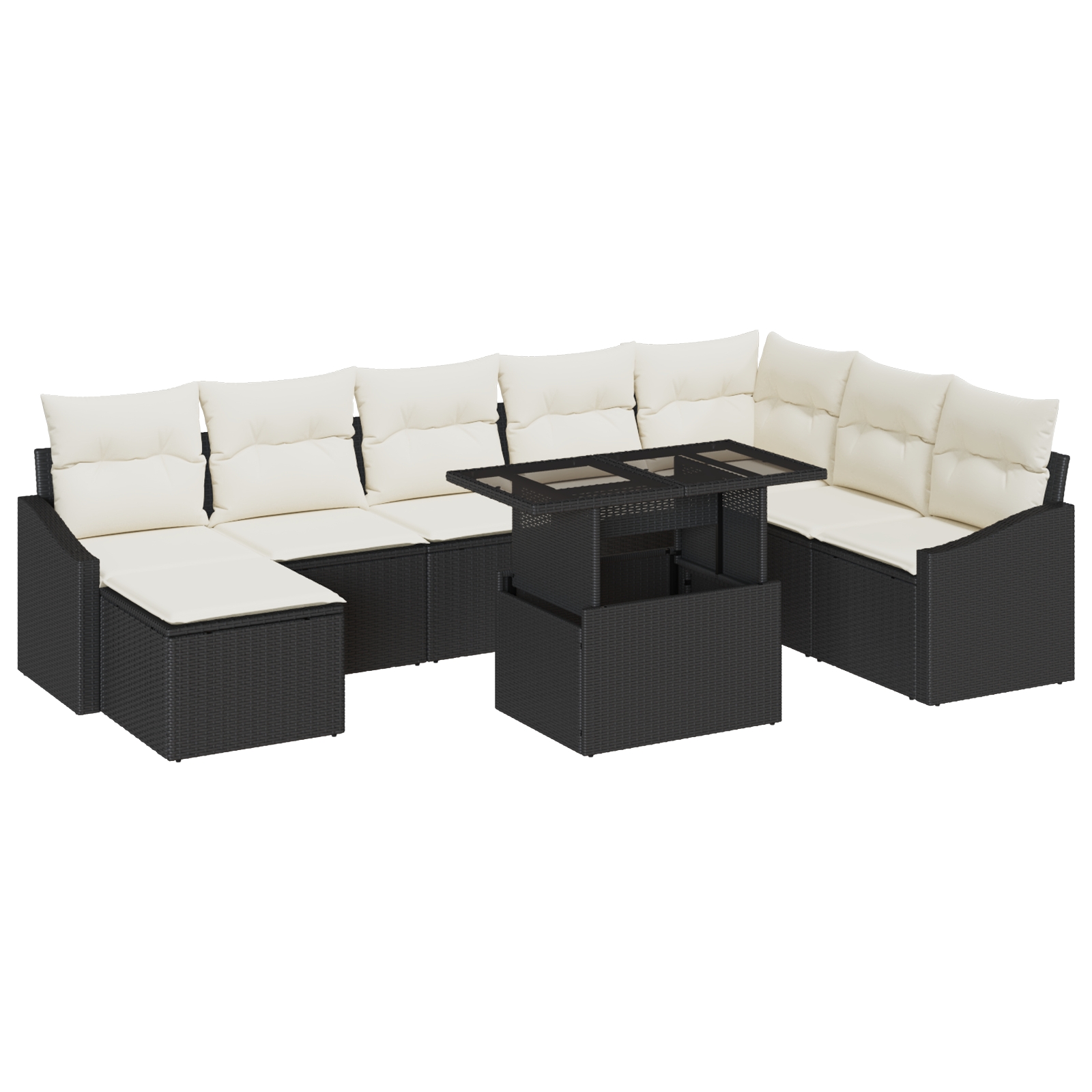Dieses 9-teilige Garten Sofa Set verwandelt Außenbereiche in tolle Lounges, perfekt zum Abhängen oder Relaxen. Mit bequemen Kissen und stylishen Poly-Rattan-Materialien bringt es Flair auf Terrassen, Gärten oder Balkonen. Dieses Sofa-Set bietet tollen Komfort und moderne Optik, die das Entspannen im Freien zum Genuss macht. Das geräumige Design bietet viel Platz für gemeinsame Zeit mit Familie und Freunden, damit jeder in der Sonne bequem sitzt. Die schicke Kombination aus schwarzem Poly-Rattan und cremefarbenen Kissen verleiht einen eleganten Touch und passt gut in verschiedene Outdoor-Stile. Der glatte Finish verstärkt die Anziehungskraft jeder Umgebung. Die robusten Materialien, einschließlich UV- und wasserabweisendem Stoff, halten unterschiedlichen Wetterbedingungen stand und sind perfekt für ganzjährigen Spaß draußen. Die einfache Pflege ist ein Pluspunkt, da die Kissenbezüge leicht abgenommen und gewaschen werden können, sodass alles frisch bleibt. Dieses vielseitige Set kann umgestaltet werden, um jeden Außenbereich zu nutzen, egal ob du eine gemütliche Ecke für zwei oder einen Hangout-Bereich für acht suchst.
