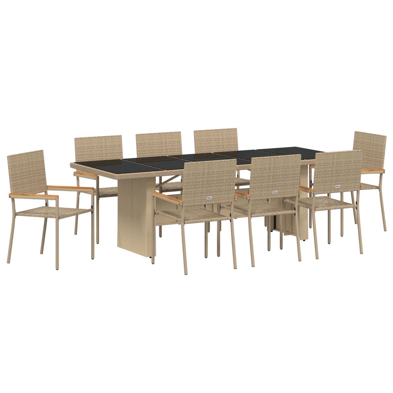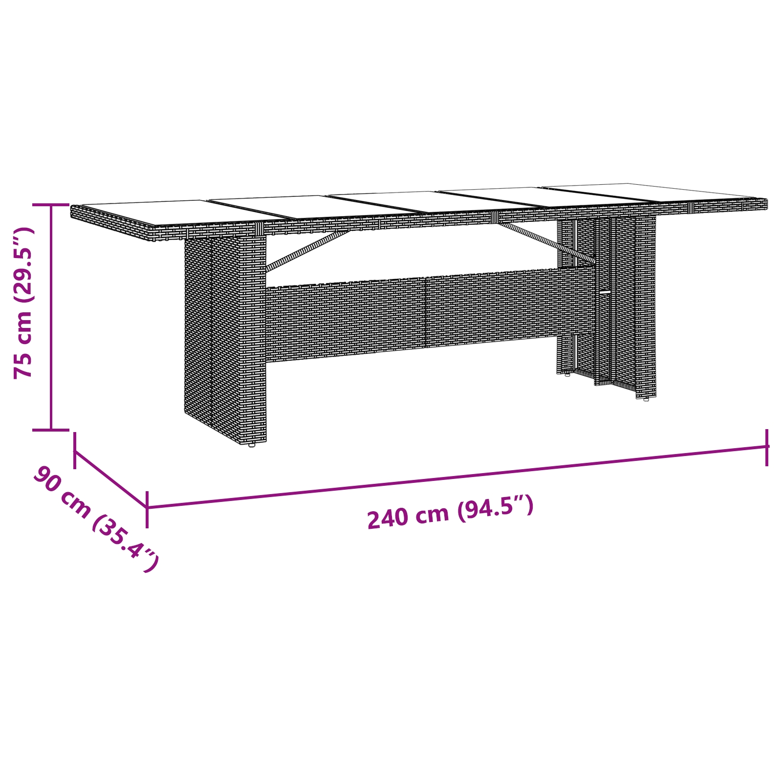 Dieser Esstisch für draußen mit Glasplatte hat ein modernes und ansprechendes Design, das jeden Außenbereich aufpeppen kann. Er ist perfekt für Familienfeiern auf der Terrasse oder Gartenpartys. Die Kombination aus robusten Materialien sorgt für praktischen Nutzen und Stil, und schafft eine einladende Atmosphäre für das Essen im Freien. Wetterfestes Design: Die Kombination aus Poly-Rattan und Sicherheitsglas macht diesen Tisch widerstandsfähig gegen Witterungsbedingungen, sodass er Regen und UV-Strahlen standhält. Viel Platz: Dieser Esstisch bietet bequem Platz für bis zu 8 Personen, ideal für Familienessen, Grillabende oder Einladungen mit Freunden im Freien. Schickes Sicherheitsglas: Die stilvolle Glasplatte sieht nicht nur toll aus, sondern ist auch leicht zu reinigen, was das Gastgeben einfacher macht. Robuster Rahmen: Mit einem stabilen, rostbeständigen Stahlrahmen ist dieser Tisch für Stabilität gebaut und kann schwerere Lasten problemlos tragen. Modernes Design: Mit klaren Linien und einem modernen Look passt er perfekt zu verschiedenen Außenstilen, von modernen Terrassen bis zu klassischen Gärten, und fügt sich harmonisch in deine Einrichtung ein.