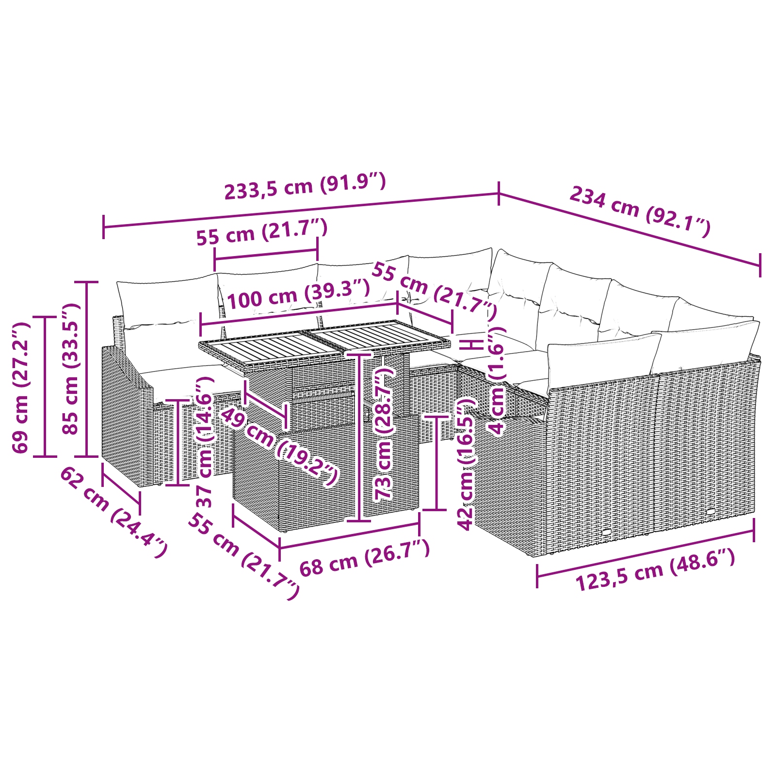 Diese 9-teilige Garten Essgruppe ist genau das Richtige für alle, die einen stylischen und praktischen Außenbereich wollen. Mit einem modernen Design hat sie bequeme cremefarbene Kissen auf einem eleganten schwarzen Poly-Rattan-Rahmen und bietet einen tollen Platz für Familienspaß oder Freunde. Komplettes Sitzarrangement: Das Set hat zwei Armsofas, zwei Ecksitze und vier Mittelsitze, bietet Platz für bis zu acht Personen. Ideal für Dinnerpartys oder lockere Zusammenkünfte, so hat jeder einen gemütlichen Platz. Integrierter Stauraum: Jedes Stück hat praktische Stauraummöglichkeiten, damit du Kissen oder kleine Sachen ordentlich verstauen kannst. Dieses Feature erhöht die Nützlichkeit des Sofasets und hilft, die Außenbereiche aufgeräumt zu halten. UV-beständiges Material: Die Möbel sind aus starkem Poly-Rattan, das UV-beständig ist, sodass sie den Witterungen standhalten und dabei stylisch bleiben. Genieß dein Outdoor-Set, ohne dir Sorgen über Sonnenschäden machen zu müssen. Moderne Ästhetik: Mit ihrem schlanken Look und der matten Oberfläche verleiht dieses Garten-Set jeder Terrasse oder jedem Balkon Eleganz. Es integriert sich gut in verschiedene Außenstile und ist eine flexible Wahl für deine Outdoor-Abenteuer. Leichte Pflege: Die Kissen haben Reißverschlüsse für einfaches Abnehmen und Reinigen. Diese Praktikabilität sorgt dafür, dass dein Essbereich das ganze Jahr über frisch und einladend aussieht.