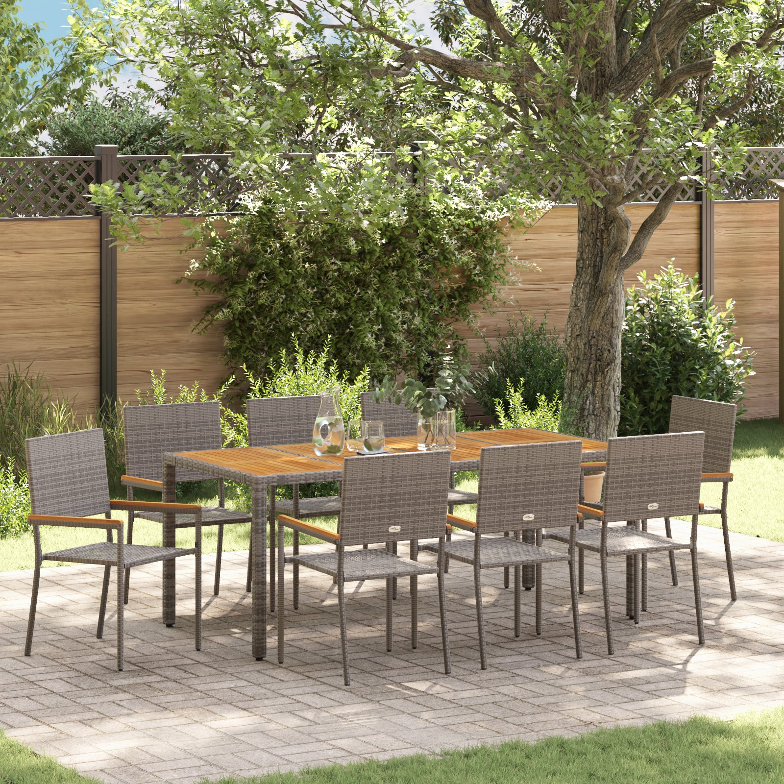 Dieses große Garten Essset vereint Eleganz und praktische Nutzbarkeit und ist perfekt für Mahlzeiten draußen. Mit seinem stylischen grauen Poly Rattan-Design und der Holzplatte ist es ideal für deine Terrasse oder deinen Garten und bietet einen tollen Platz zum Entspannen und für gesellige Runden. Modernes Design: Das Set hat einen coolen, stylischen Look, der besten für große Terrassen, Gärten oder Balkone passt. Die acht gepolsterten Stühle sorgen für Komfort und machen längere Mahlzeiten mit Freunden und Familie angenehm. Haltbare Materialien: Hergestellt aus hochwertigen, UV-beständigen Materialien, damit es in der Sonne gut aussieht und dir viele Jahre lang Freude bereitet. Geräumige Sitzmöglichkeiten: Dieses Essset hat Platz für bis zu acht Personen – ideal für familiäre Gespräche oder um Gäste zu bewirten und verwandelt deinen Außenbereich in ein genussvolles Erlebnis. Einfache Pflege: Die Materialien lassen sich spielend leicht reinigen und helfen, deinen Außenbereich das ganze Jahr über frisch und einladend zu halten. Bequeme Eigenschaften: Jeder Stuhl hat weiche Kissen, die Komfort und Entspannung während längerer Treffen im Freien bieten.