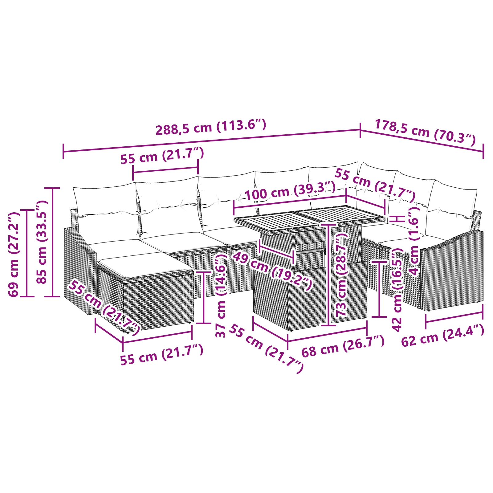 - Lieferumfang: 2 x Armsofa mit Stauraum, 1 x Ecksofa mit Stauraum, 4 x Mittelsofas mit Stauraum, 1 x Fußhocker mit Stauraum, 1 x Gartentisch