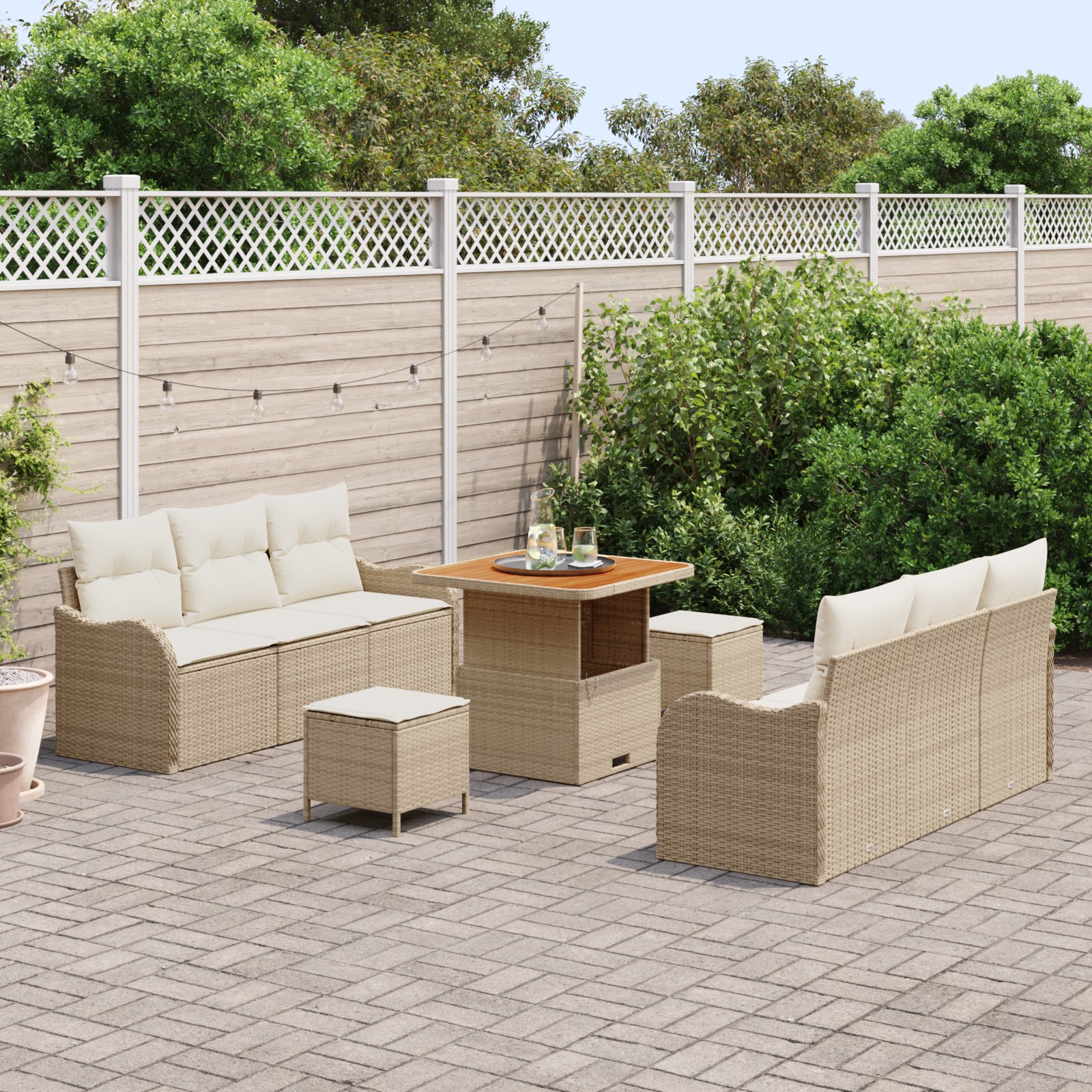 9-teiliges Garten-Sofa-Set mit Kissen, beige Poly Rattan Akazie, 2-Sitzer Garten-Sofa mit Kissen, beige Poly Rattan, 3-teiliges Garten-Essbereich-Set mit Kissen, beige Poly Rattan Akazie