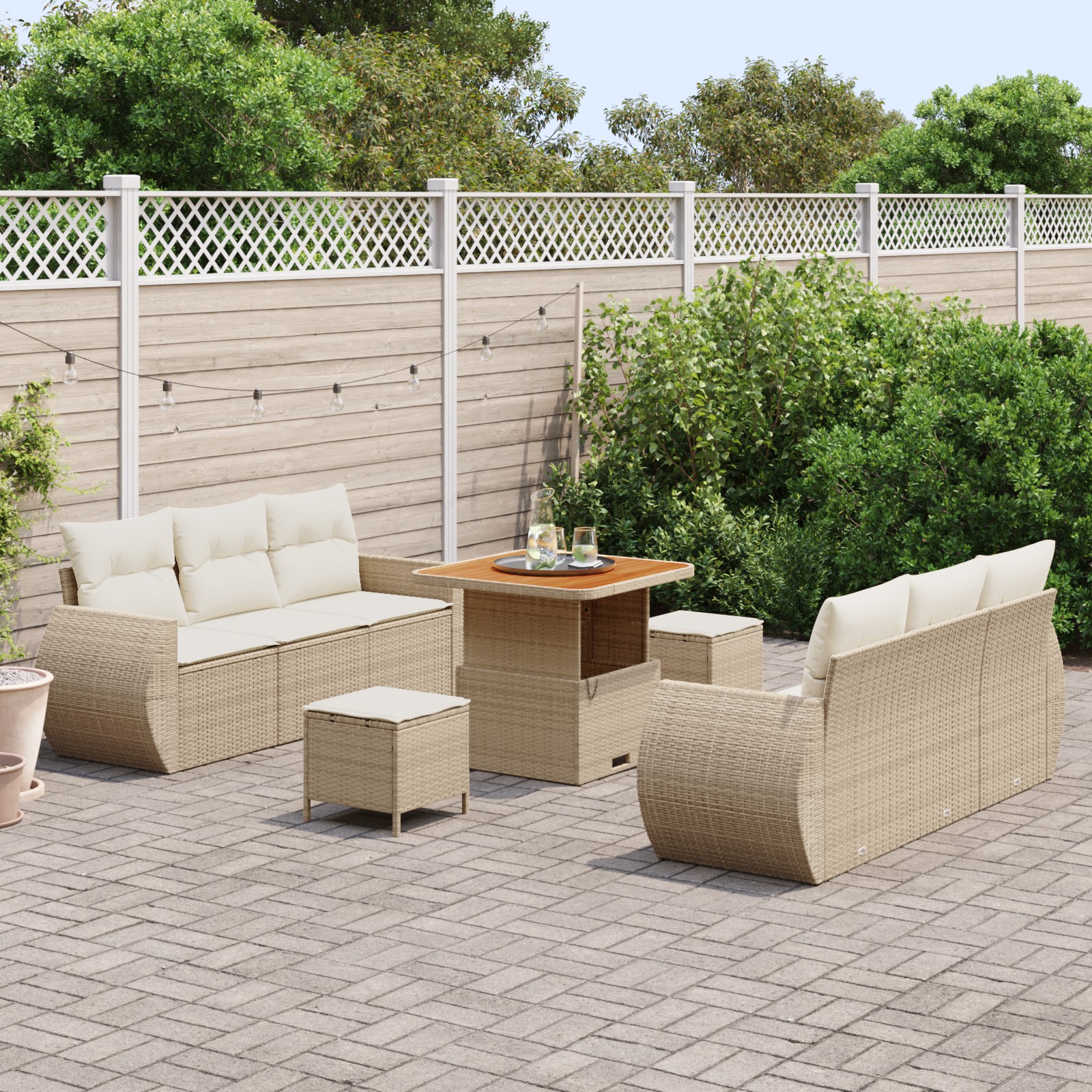 Dieses Garten Sofa Set hat ein modernes Design, gefertigt aus handgewebtem synthetischem Poly Rattan und weichen beigen Kissen. Ideal für entspannte Stunden im Freien und in seinem modularen Stil kannst du es nach deinem Geschmack für deinen Patio, Balkon oder Garten anpassen. Modulare Flexibilität: Das modulare Design lässt dich das Sofa nach deinen Wünschen gestalten, sei es gemütlich oder für eine große Runde. Passe es deinem Außenbereich an und schaffe eine einladende Atmosphäre für Zusammenkünfte. Wetterbeständige Materialien: Aus robustem Poly Rattan, das UV-Strahlen trotzt, sodass das Sofa bei jedem Wetter gut aussieht. Auch die Kissenbezüge sind aus hochwertigem Polyester, was die Langlebigkeit des Sets steigert. Maximaler Komfort: Jeder Sitz ist mit weichen, bequemen Kissen in cremeweiß ausgestattet, die zum Entspannen einladen. Ideal für Gartenpartys oder einfach zum Chillen an sonnigen Nachmittagen, die Polsterung sorgt dafür, dass sich jeder wohlfühlt. Eleganter Touch: Mit seiner schicken beige Oberfläche und einem stilvollen Tisch aus Akazienholz strahlt dieses Set moderne Eleganz aus. Es ist nicht nur Möbel; es ist ein Statement-Stück, das deinen Außenbereich aufwertet und funktionale Sitzmöglichkeiten bietet. Einfach zu reinigen: Abnehmbare Kissenbezüge und abwischbare Oberflächen machen die Pflege deines Sofa Sets zum Kinderspiel. Genieße das Leben im Freien ohne Stress, da dieses Set für den täglichen Gebrauch konzipiert ist.