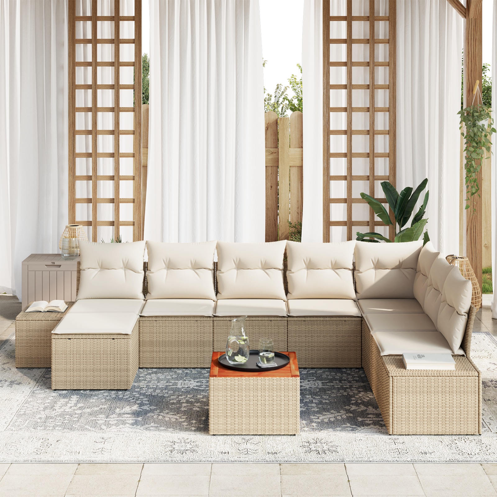 - Lieferumfang: 4 x Mittelsofa mit Stauraum, 1 x Ecksofa mit Stauraum, 2 x Sofa mit Stauraum, 1 x Fußhocker mit Stauraum, 1 x Gartentisch