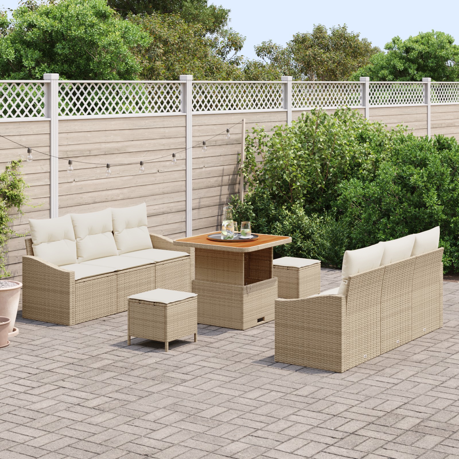 Dieses stylische Garten Sofa Set bringt das Leben im Freien auf ein neues Level. Es eignet sich perfekt für Balkone, Gärten oder Terrassen. Hergestellt aus beigem Poly-Rattan und bequemen cremeweißen Kissen bietet es nicht nur Komfort, sondern verwandelt deinen Außenbereich in einen coolen Treffpunkt. Modulares Design: Stell es um, wie es zu deinem Raum und deinen Treffen passt, von gemütlichen Familienabenden bis zu lebhaften Grillpartys. Verstellbare Füße: Hält stabil auf unebenem Boden, perfekt für jedes Outdoor-Setting, damit du entspannt sein kannst. Handgewebt: Hat ein cooles handgewebtes Design, das tolle Handwerkskunst zeigt und deinem Außenbereich Klasse verleiht. Wetterfeste Kissen: Kissen, die dafür gemacht sind, im Freien standzuhalten, und ihre Form und ihren Look bewahren, während du chillst. Einfache Pflege: Einfach mit einem feuchten Tuch abwischen und die Kissen richtig lagern, damit sie lange halten und gut aussehen.