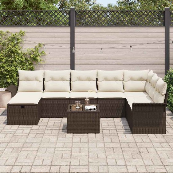Dieses 9-teilige Garten-Sofa-Set bietet dir jede Menge stylische Sitzgelegenheiten für draußen. Mit dem schicken braunen Poly-Rattan-Finish und bequemen Kissen ist es eine top Wahl zum Entspannen oder Quatschen – ideal für größere Terrassen, Gärten oder Sonnenliegen. Komfortable Sitze: Die weichen Kissen für draußen bieten tollen Komfort für lange Gespräche, damit du die Zeit mit Familie und Freunden genießen kannst. Stylisches Design: Mit seinem modernen Look bringt die strukturierte Oberfläche richtig Charme und passt perfekt zu jedem modernen Garten oder auf die Terrasse. Aufbewahrungsfunktion: Jedes Teil hat praktische Stauraummöglichkeiten, um deinen Außenbereich ordentlich zu halten und die Kissen vor Abnutzung zu schützen. Haltbare Materialien: Robuster Poly-Rattan-Rahmen und wetterfeste Eigenschaften – du kannst sicher sein, dass dieses Set über die Saisons hinweg gut aussieht. Vielseitige Nutzung: Kombiniere die Teile zum Entspannen, Essen oder Treffen und schaffe einen gemütlichen Rückzugsort im Freien, um tolle Erinnerungen zu sammeln.