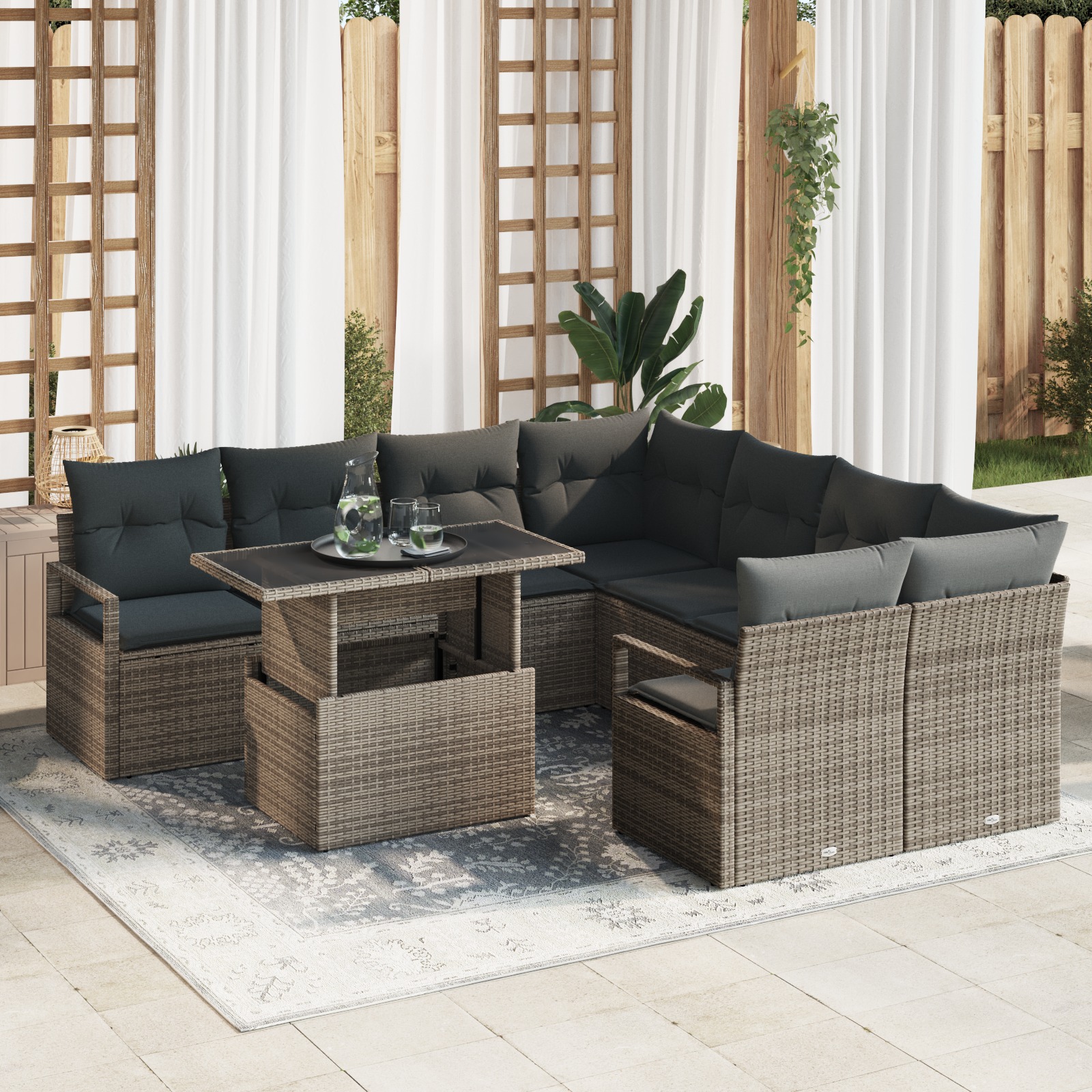 Dieses Garten Sofa Set ist eine coole Bereicherung für jeden Außenbereich. Es vereint schickes Design mit praktischen Vorteilen. Der elegante graue Poly-Rattan-Rahmen und die weichen grauen Kissen bieten dir einen bequemen Platz, um zu entspannen oder zu feiern, und verwandeln deinen Balkon, deine Terrasse oder deinen Garten in einen trendigen Rückzugsort. Sichtbarkeit: Das handgewebte Design bringt Eleganz und Einzigartigkeit, sodass jedes Stück auffällt. Kissenkomfort: Die wetterfesten Sitzkissen bieten tollen Komfort, damit lange Gespräche im Freien angenehm bleiben. Vielseitige Nutzung: Ideal für den Außenbereich, passt dieses Set zu allen Anlässen, egal ob du Freunde einlädst oder einen ruhigen Abend für dich genießt. Einfache Pflege: Abnehmbare Kissenbezüge machen die Reinigung einfach, damit deine Möbel das ganze Jahr über frisch bleiben. Geräumige Sitzgelegenheit: Bietet Platz für bis zu sechs Personen, wodurch dein Außenbereich zu einem lebendigen Treffpunkt wird.
