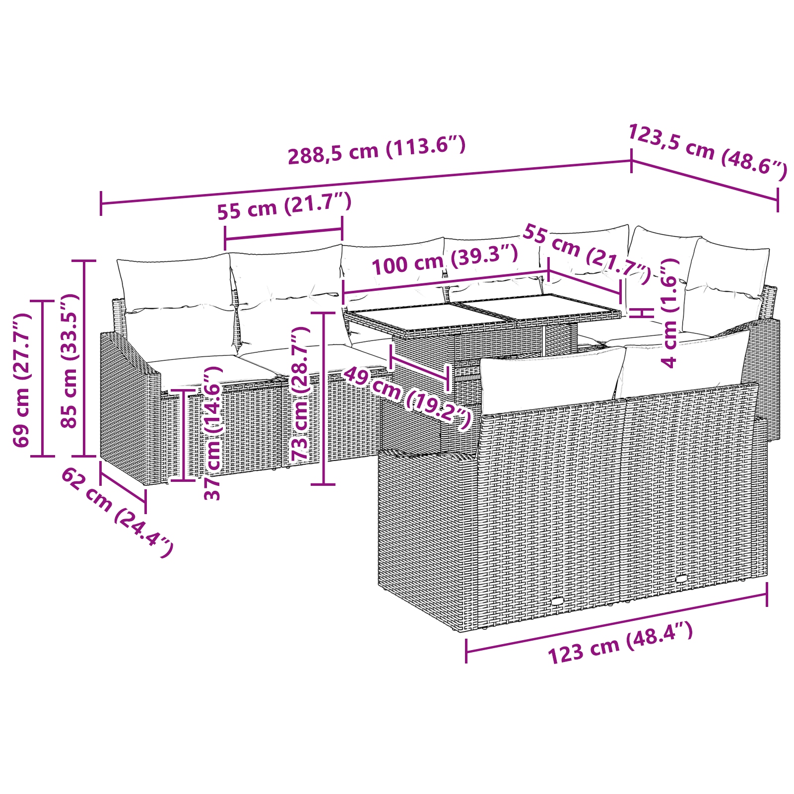 Dieses 9-teilige Outdoor Sofa Set kombiniert Stil und Funktion für jede Terrasse oder jeden Garten. Hergestellt aus hochwertigem Rattan Geflecht und einem stabilen Rahmen, sieht es gut aus und hält auch bei schlechtem Wetter. Ideal für den Außeneinsatz. Die weichen, grauen Kissen bieten Wärme und Komfort und machen es zu einem tollen Platz zum Entspannen am Abend. Wetterfestes Material sorgt dafür, dass es langlebig ist, sodass du das ganze Jahr über Freude daran hast. Dieses Ecksofa hat Platz für bis zu acht Personen, perfekt für gesellige Zusammenkünfte oder Sommer-BBQs. Das moderne Design mit klaren Linien bringt Eleganz in jeden Außenbereich. Die Reinigung ist ein Kinderspiel dank der abnehmbaren Kissenbezüge.