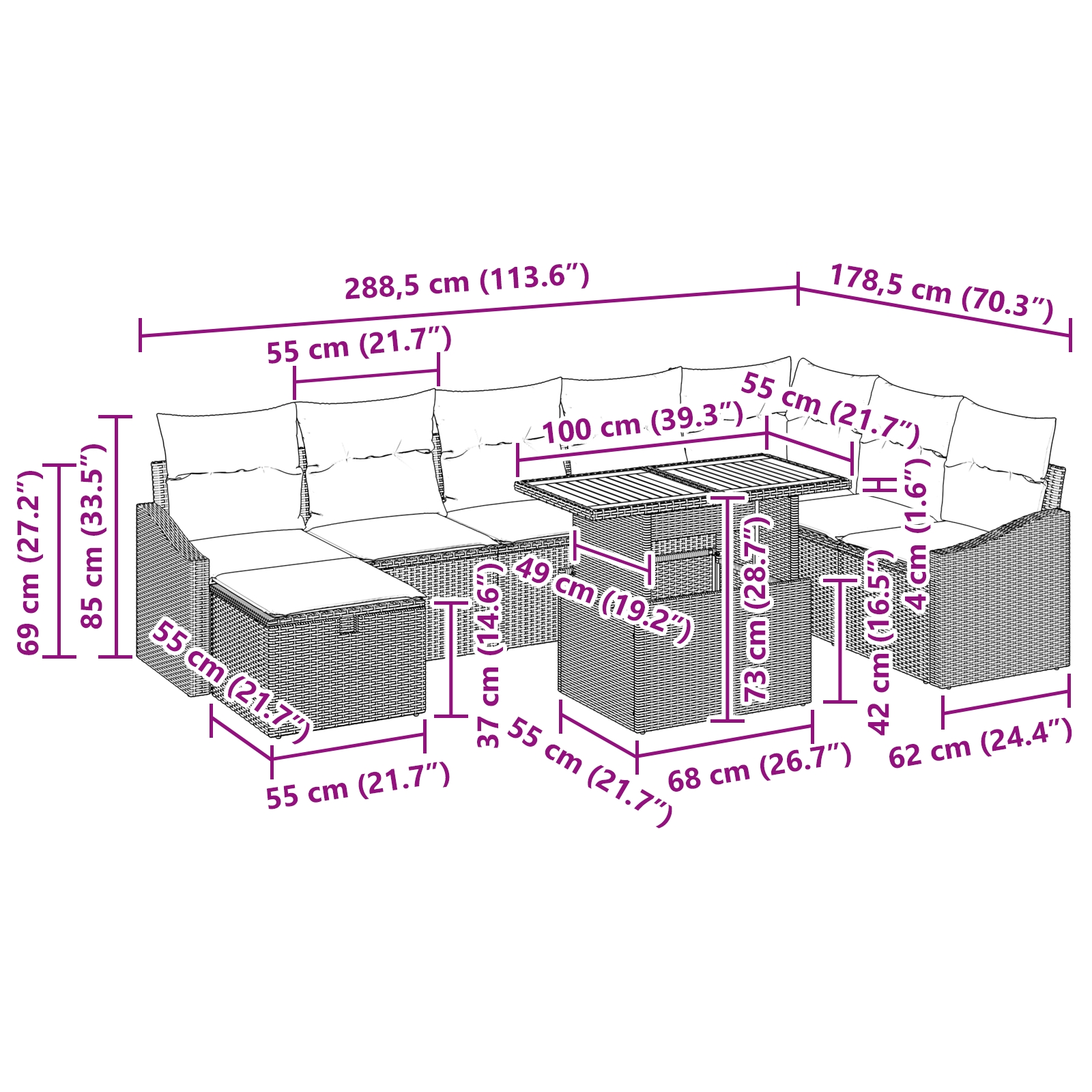 - Lieferumfang: 4 x Mittel Sitz mit Stauraum, 1 x Eck Sitz mit Stauraum, 2 x Armsofa mit Stauraum, 1 x Fußhocker mit Stauraum, 1 x Gartentisch