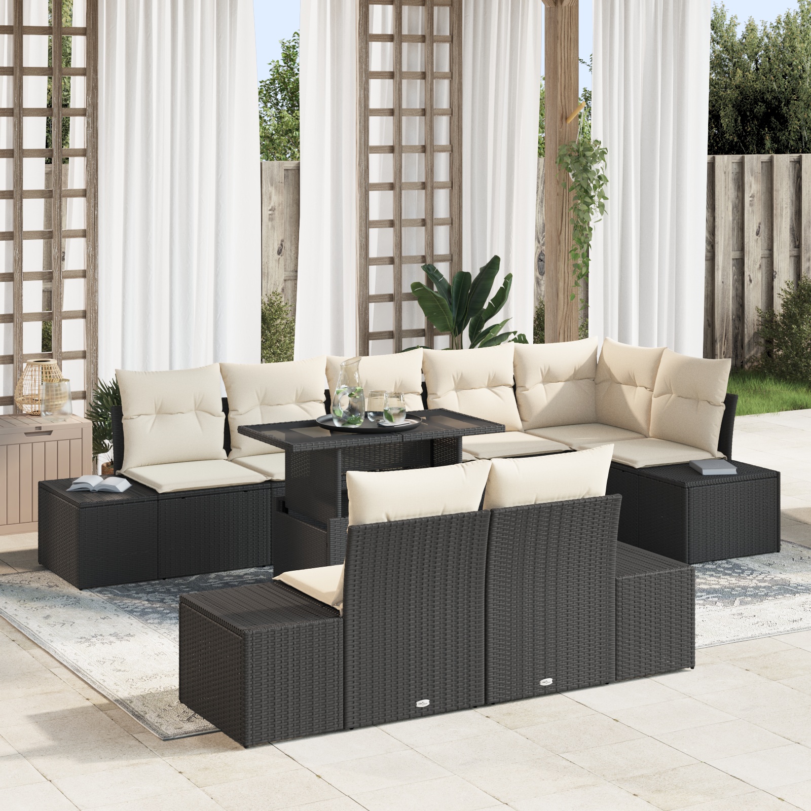 Dieses 9-teilige Garten-Sofa-Set mit Kissen ist funktional und schick, was es zu einer tollen Ergänzung für jeden Innen- oder Außenbereich macht. Mit seiner coolen Schwarz-Creme-Farbkombination und dem modernen Design schafft dieses modulare Sofa-Set eine einladende Stimmung für Zusammenkünfte, Entspannen oder Essen und bietet Platz für bis zu 8 Personen. 【Bequeme Sitzgelegenheiten】 Jedes Teil des Garten-Sofa-Sets hat Kissen für ultimativen Komfort über längere Zeit. Die Kissen sind mit leichtem Schaumstoff gefüllt, der sich gut an deinen Körper anpasst und dir ein angenehmes Sitzerlebnis für deinen Outdoor-Spaß bietet. 【Stylisches modernes Design】 Die schicke Ausführung und die tolle Farbkombination bringen modernen Chic in deine Gartenausstattung. Diese Designelemente verbessern nicht nur das Aussehen deiner Terrasse, sondern passen auch gut zu anderen Gartenmöbeln. 【Langlebig gebaut】 Hergestellt aus wetterfestem synthetischem Poly-Rattan und einem stabilen Stahlrahmen, kann dieses Sofa-Set allen Wetterbedingungen standhalten. Die Materialien sind so konzipiert, dass sie nicht verblassen, und halten deine Möbel jahrelang frisch. 【Platzsparender Stauraum】 Jedes Teil des Sofas hat praktischen Stauraum, damit du deinen Außenbereich ordentlich halten kannst. Ideal zum Verstauen von Kissen, Gartengeräten oder Zeitschriften – es maximiert den Komfort ohne Unordnung. 【Vielseitige Anordnung】 Das modulare Design ermöglicht es dir, die Anordnung an deinen Raum und deine Bedürfnisse anzupassen, egal ob für intime Zusammenkünfte oder größere Feiern – perfekt für Patios, Balkone oder Gärten.