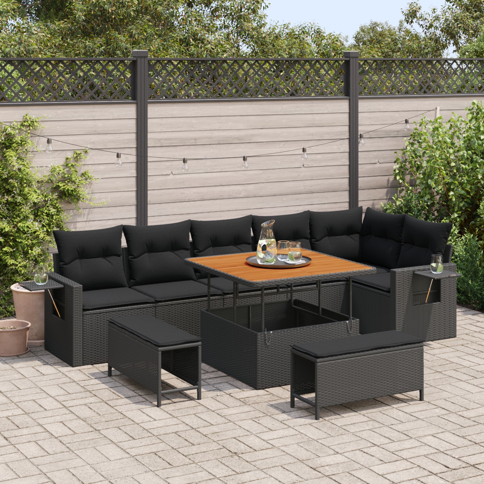 Dieses Garten Sofa Set kombiniert Eleganz mit Funktionalität und ist die perfekte Wahl für deinen Außenbereich. Mit seinem modernen Look ist dieses modulare Set ideal für Zusammenkünfte und sorgt für eine gemütliche Atmosphäre auf Terrassen, Balkonen oder im Garten. Hochwertige Materialien: Hergestellt aus UV-beständigem Poly-Rattan und solidem Akazienholz, stilvoll und wetterfest. Bequeme Sitze: Kommt mit sieben gut gepolsterten Sitzen für eine gemütliche Zeit beim Chillen und Reden. Modulares Design: Das coole modulare Setup lässt dich die Teile ganz einfach umstellen, um deinen Vibe anzupassen. Stylische Ästhetik: Das schlanke schwarze Finish zusammen mit natürlichem Akazienholz verleiht diesem Set ein elegantes Gefühl und verbessert das Aussehen deines Außenbereichs. Einfach zu pflegen: Abnehmbare, waschbare Kissen und wasserdichte Materialien sorgen für eine einfache Pflege, um die Schönheit deines Außenbereichs zu erhalten.