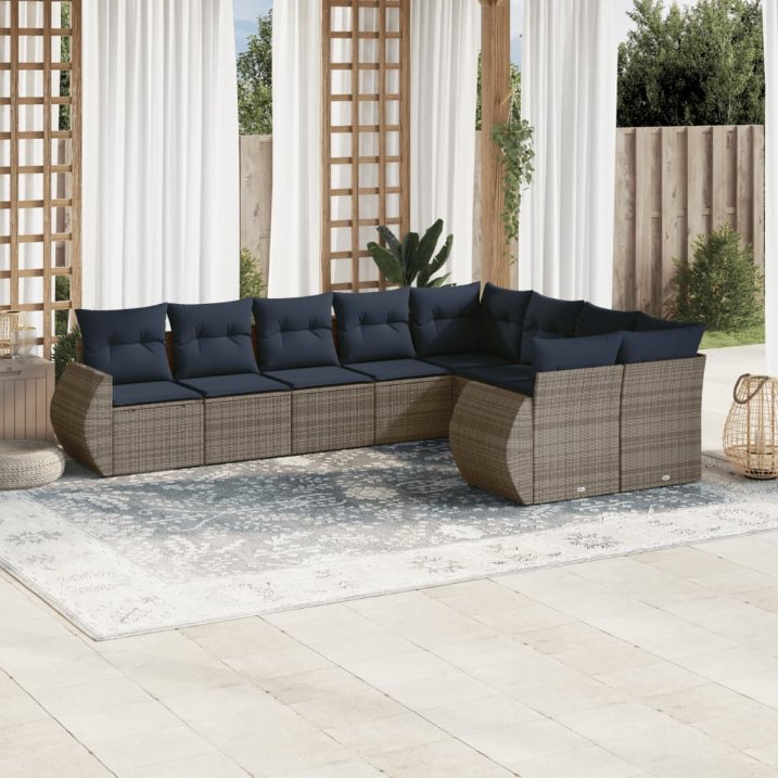 9-teiliges Gartensofa-Set mit Kissen, grau, Polyrattan