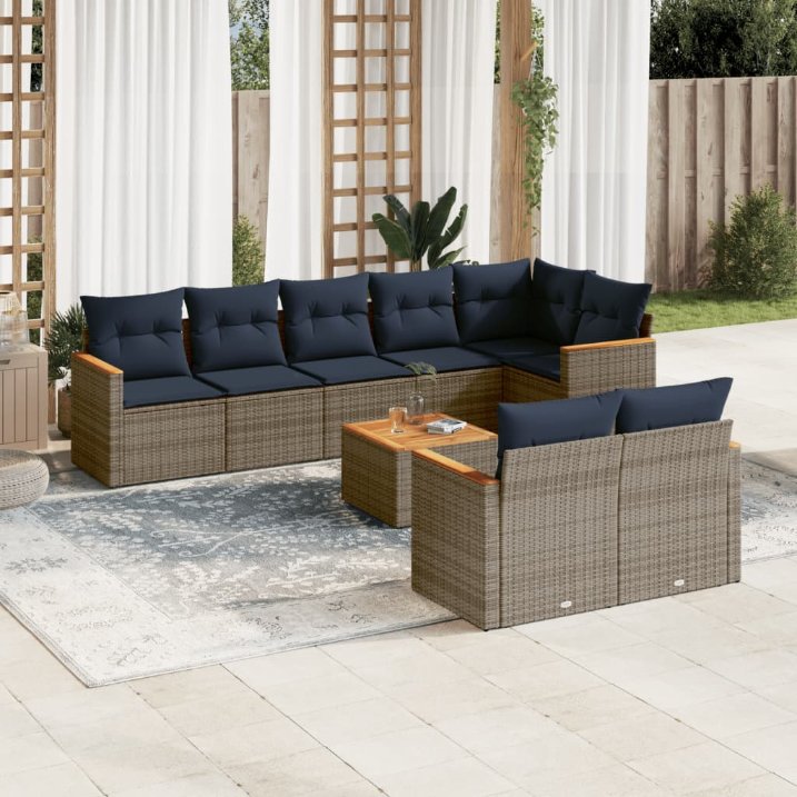 Dieses Gartensofa-Set ist die perfekte Ergänzung für Ihren Garten, Ihre Terrasse oder Ihren Innenhof und bietet einen komfortablen und einladenden Platz zum Plaudern mit Familie und Freunden oder einfach zum Entspannen und Genießen der Natur. Langlebiges Material: PE-Rattan, auch bekannt als Polyrattan, ist ein starkes, pflegeleichtes synthetisches Material, das wie natürliches Rattan aussieht. Es ist leicht, einfach zu reinigen und wird aufgrund seiner Langlebigkeit und Wetterbeständigkeit häufig für Gartenmöbel verwendet.Stabile und pflegeleichte Tischplatte: Dieser Gartentisch hat eine Tischplatte aus Akazienholz, die robust, langlebig und mit einem feuchten Tuch leicht zu reinigen ist.Abnehmbarer und waschbarer Bezug: Diese Sitzkissen verfügen über abnehmbare Bezüge zum einfachen Waschen und Pflegen.Robuster und stabiler Rahmen: Der pulverbeschichtete Stahlrahmen sorgt dafür, dass die Gartenmöbel für den täglichen Gebrauch im Freien robust und stabil sind.Modulares Design: Dieses Gartenmöbelset ist modular aufgebaut und daher völlig flexibel und leicht zu bewegen, sodass Sie Ihre Gartenmöbel individuell zusammenstellen können. Gut zu wissen:Damit Ihre Gartenmöbel schön bleiben, empfehlen wir Ihnen, sie mit einer wasserdichten Abdeckung zu schützen.