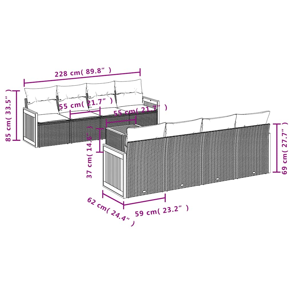Dieses Gartensofa-Set ist die perfekte Ergänzung für Ihren Garten, Ihre Terrasse oder Ihren Innenhof und bietet einen komfortablen und einladenden Platz zum Plaudern mit Familie und Freunden oder einfach zum Entspannen und Genießen der Natur. Langlebiges Material: PE-Rattan, auch bekannt als Polyrattan, ist ein starkes, pflegeleichtes synthetisches Material, das wie natürliches Rattan aussieht. Es ist leicht, einfach zu reinigen und wird aufgrund seiner Langlebigkeit und Wetterbeständigkeit häufig für Gartenmöbel verwendet.Bequemes Sitzerlebnis: Diese Gartenmöbel mit dick gepolsterten Kissen bieten ein bequemes Sitzerlebnis.Stabile und pflegeleichte Tischplatte: Dieser Gartentisch hat eine Tischplatte aus Akazienholz, die robust, langlebig und mit einem feuchten Tuch leicht zu reinigen ist.Abnehmbarer und waschbarer Bezug: Diese Sitzkissen verfügen über abnehmbare Bezüge für einfaches Waschen und Pflegen.Modulares Design: Dieses Gartenmöbelset ist modular aufgebaut und daher völlig flexibel und leicht zu bewegen, sodass Sie Ihre Gartenmöbel individuell zusammenstellen können. Gut zu wissen:Damit Ihre Gartenmöbel schön bleiben, empfehlen wir Ihnen, sie mit einer wasserdichten Abdeckung zu schützen.