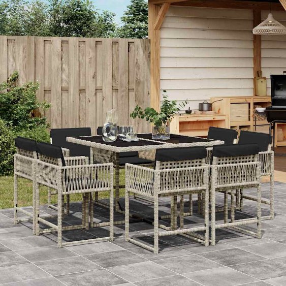 Diese Garten-Essgruppe ist eine ideale Wahl für Mahlzeiten im Freien oder einfach nur zum Entspannen im Garten, Hinterhof oder auf der Terrasse. Langlebiges Material: PE-Rattan, auch als Poly Rattan bekannt, ist ein robustes, pflegeleichtes synthetisches Material, das die Optik von natürlichem Rattan aufweist. Es kennzeichnet sich durch ein geringes Eigengewicht und lässt sich einfach reinigen. Aufgrund seiner Haltbarkeit und Witterungsbeständigkeit wird es häufig bei der Herstellung von Gartenmöbeln verwendet.Platzsparende Aufbewahrung: Dank der klappbaren Rückenlehnen lassen sich die Stühle unter dem Tisch verstauen, sodass die gesamte Essgruppe bei Nichtgebrauch eine platzsparende Würfelform bildet.Bequemes Sitzerlebnis: Dieser Gartensessel mit dick gepolsterten Kissen bietet ein angenehmes Sitzgefühl.Abnehmbarer und waschbarer Bezug: Die Sitzkissen verfügen über abnehmbare Bezüge, die sich ganz einfach waschen und reinigen lassen. Dank der Klappen an der Rückseite können die Kissen ganz einfach an den Rückenlehnen befestigt werden.Tischplatte aus Glas: Die Tischplatte des Gartentisches besteht aus starkem und langlebigem Hartglas, sodass sie leicht mit einem feuchten Tuch gereinigt werden kann und deinem Außenbereich einen Hauch von Eleganz verleiht. Gut zu wissen:Wir empfehlen dir, deine Gartenmöbel mit einer wasserdichten Hülle zu schützen, um lange Zeit eine ansprechende Optik aufzuweisen.