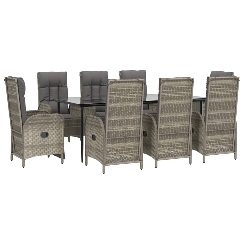Mit ihrem eleganten und modernen Design ist diese trendige Garten-Essgruppe eine großartige Wahl für Mahlzeiten oder zum Entspannen in deinem Garten. Wetterfestes Material: PE-Rattan, auch als Poly Rattan bekannt, ist witterungsbeständig und pflegeleicht. Seine Oberfläche weist lange Zeit eine ansprechende Optik auf. Es bietet hohe Qualität, Komfort und einen ästhetisches Look.Stabiler Rahmen: Dank der pulverbeschichteten Stahlrahmen ist die Outdoor-Essgruppe robust, stabil und für den täglichen Einsatz im Außenbereich bestens geeignet.Praktische Tischplatte: Die glatte Tischplatte besteht aus Hartglas, das sich leicht mit einem feuchten Tuch reinigen lässt. Darüber hinaus bietet die stabile Tischplatte den perfekten Platz für Speisen, Getränke und verschiedene Dekoartikel.Liegefunktion: Diese Gartensessel sind mit Liegefunktion ausgestattet, sodass sich die Rückenlehne je nach Bedarf verstellen lässt.Bequemes Sitzgefühl: Die Rückenlehne verleiht dem Gartenstuhl höchsten Sitzkomfort. Zum hohen Sitzkomfort tragen auch die dick gepolsterten Kissen bei. Gut zu wissen:Um die Montage so einfach wie möglich zu machen, wird jedes Produkt mit einer Anleitung geliefert. Hinweis:Damit deine Gartenmöbel lange schön bleiben, empfehlen wir dir, sie mit einer wasserdichten Hülle zu schützen.