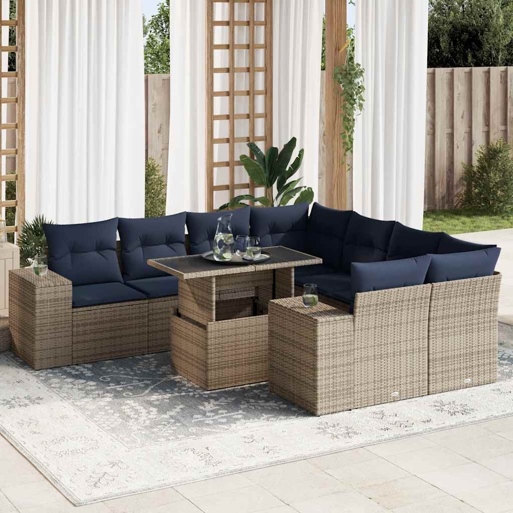 Diese Garten-Sofagarnitur ist die perfekte Ergänzung zu deinem Garten, deiner Terrasse oder deinem Innenhof. Sie bietet einen bequemen und einladenden Platz, um mit Familie und Freunden zu plaudern oder dich einfach nur zu entspannen und das Leben im Freien zu genießen.Langlebiges Material: PE-Rattan, auch als Poly Rattan bekannt, ist ein robustes, pflegeleichtes synthetisches Material, das die Optik von natürlichem Rattan aufweist. Es kennzeichnet sich durch ein geringes Eigengewicht und lässt sich einfach reinigen. Aufgrund seiner Haltbarkeit und Witterungsbeständigkeit wird es häufig bei der Herstellung von Gartenmöbeln verwendet.Stauraum mit wasserfestem Beutel: Jedes Gartensofa verfügt über ein Staufach unter der Sitzfläche, das mit einem wasserfesten Beutel zur Aufbewahrung von Kissen, Spielzeug und anderen Gegenständen versehen ist. Die Kissen sind mit Bezügen versehen und lassen sich mit Klettverschlüssen fest und sicher an den Sofas befestigen.Abnehmbarer und waschbarer Bezug: Diese Sitzkissen verfügen über abnehmbare Bezüge für einfaches Waschen und Pflegen.Modulares Design: Dank des modularen Designs lassen sich die Gartenmöbel völlig flexibel und einfach umstellen, um deinen Außenbereich ganz individuell zu gestalten.Gut zu wissen:Wir empfehlen dir, deine Gartenmöbel mit einer wasserdichten Hülle zu schützen, um lange Zeit eine ansprechende Optik aufzuweisen.