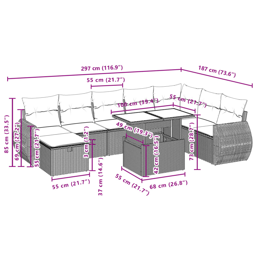 Diese Garten-Sofagarnitur ist die perfekte Ergänzung zu deinem Garten, deiner Terrasse oder deinem Innenhof. Sie bietet einen bequemen und einladenden Platz, um mit Familie und Freunden zu plaudern oder dich einfach nur zu entspannen und das Leben im Freien zu genießen. Langlebiges Material: PE-Rattan, auch als Poly Rattan bekannt, ist ein robustes, pflegeleichtes synthetisches Material, das die Optik von natürlichem Rattan aufweist. Es kennzeichnet sich durch ein geringes Eigengewicht und lässt sich einfach reinigen. Aufgrund seiner Haltbarkeit und Witterungsbeständigkeit wird es häufig bei der Herstellung von Gartenmöbeln verwendet.Verstellbare Tischplatte: Die Tischplatte lässt sich anheben, um den Gartentisch höher zu machen und ihn von einem Couchtisch in einen Esstisch zu verwandeln. Der Tisch eignet sich daher perfekt für Gäste oder Mahlzeiten im Freien.Tischplatte aus Glas: Die Tischplatte des Gartentisches besteht aus starkem und langlebigem Hartglas, sodass sie leicht mit einem feuchten Tuch gereinigt werden kann und deinem Außenbereich einen Hauch von Eleganz verleiht.Abnehmbarer und waschbarer Bezug: Diese Sitzkissen verfügen über abnehmbare Bezüge für einfaches Waschen und Pflegen.Modulares Design: Dank des modularen Designs lassen sich die Gartenmöbel völlig flexibel und einfach umstellen, um deinen Außenbereich ganz individuell zu gestalten. Gut zu wissen:Wir empfehlen dir, deine Gartenmöbel mit einer wasserdichten Hülle zu schützen, um lange Zeit eine ansprechende Optik aufzuweisen.