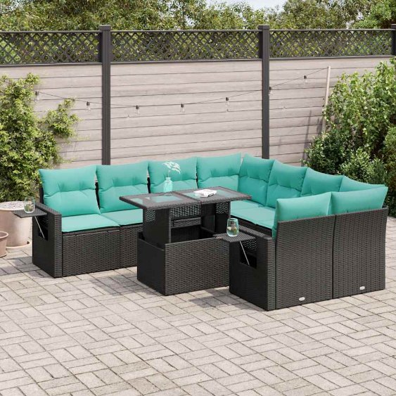Diese Garten-Sofagarnitur ist die perfekte Ergänzung zu deinem Garten, deiner Terrasse oder deinem Innenhof. Sie bietet einen bequemen und einladenden Platz, um mit Familie und Freunden zu plaudern oder dich einfach nur zu entspannen und das Leben im Freien zu genießen.Langlebiges Material: PE-Rattan, auch als Poly Rattan bekannt, ist ein robustes, pflegeleichtes synthetisches Material, das die Optik von natürlichem Rattan aufweist. Es kennzeichnet sich durch ein geringes Eigengewicht und lässt sich einfach reinigen. Aufgrund seiner Haltbarkeit und Witterungsbeständigkeit wird es häufig bei der Herstellung von Gartenmöbeln verwendet.Stauraum mit wasserfestem Beutel: Jedes Gartensofa verfügt über ein Staufach unter der Sitzfläche, das mit einem wasserfesten Beutel zur Aufbewahrung von Kissen, Spielzeug und anderen Gegenständen versehen ist. Die Kissen sind mit Bezügen versehen und lassen sich mit Klettverschlüssen fest und sicher an den Sofas befestigen.Praktische Ablage: Dieses Gartensofa verfügt über eine klappbare Ablage mit Gasfeder, auf der du verschieden Sachen griffbereit aufbewahren kannst.Abnehmbarer und waschbarer Bezug: Diese Sitzkissen verfügen über abnehmbare Bezüge für einfaches Waschen und Pflegen.Modulares Design: Dank des modularen Designs lassen sich die Gartenmöbel völlig flexibel und einfach umstellen, um deinen Außenbereich ganz individuell zu gestalten.Gut zu wissen:Wir empfehlen dir, deine Gartenmöbel mit einer wasserdichten Hülle zu schützen, um lange Zeit eine ansprechende Optik aufzuweisen.