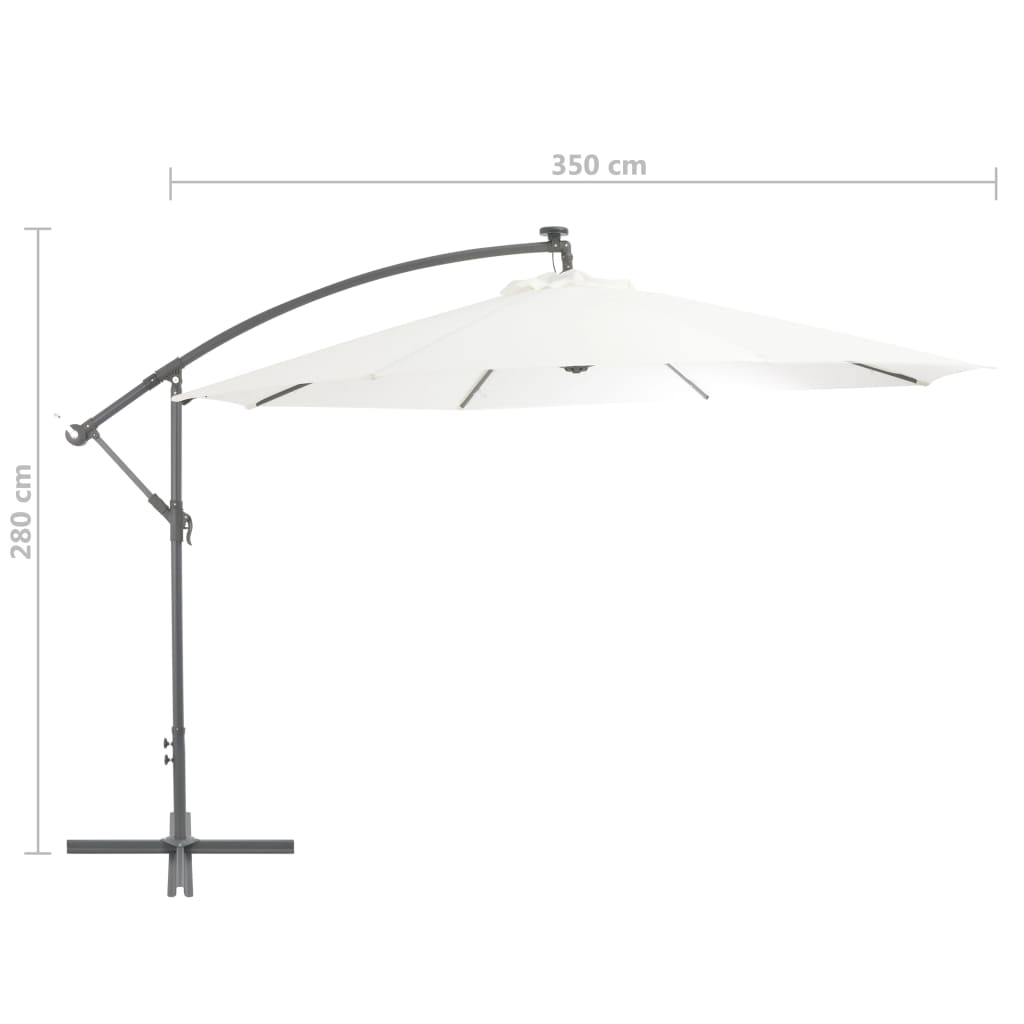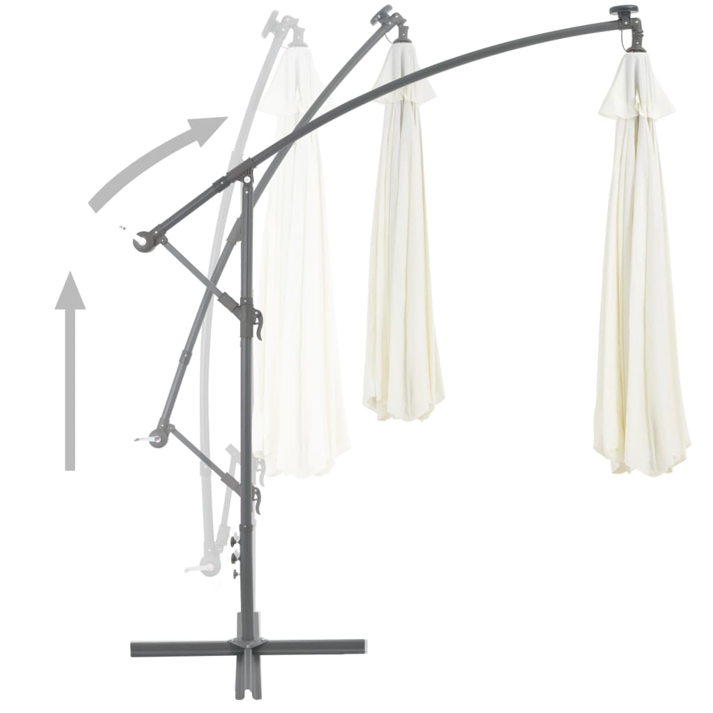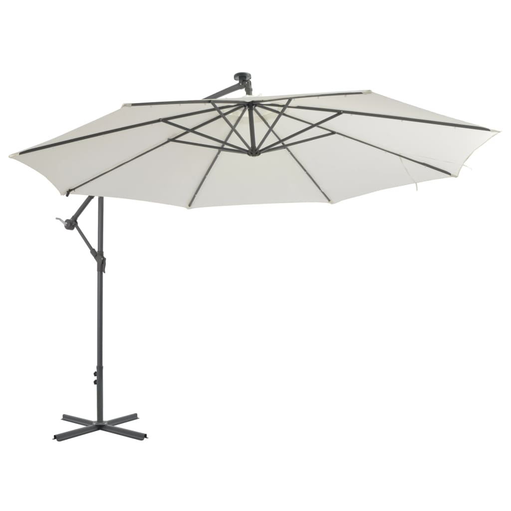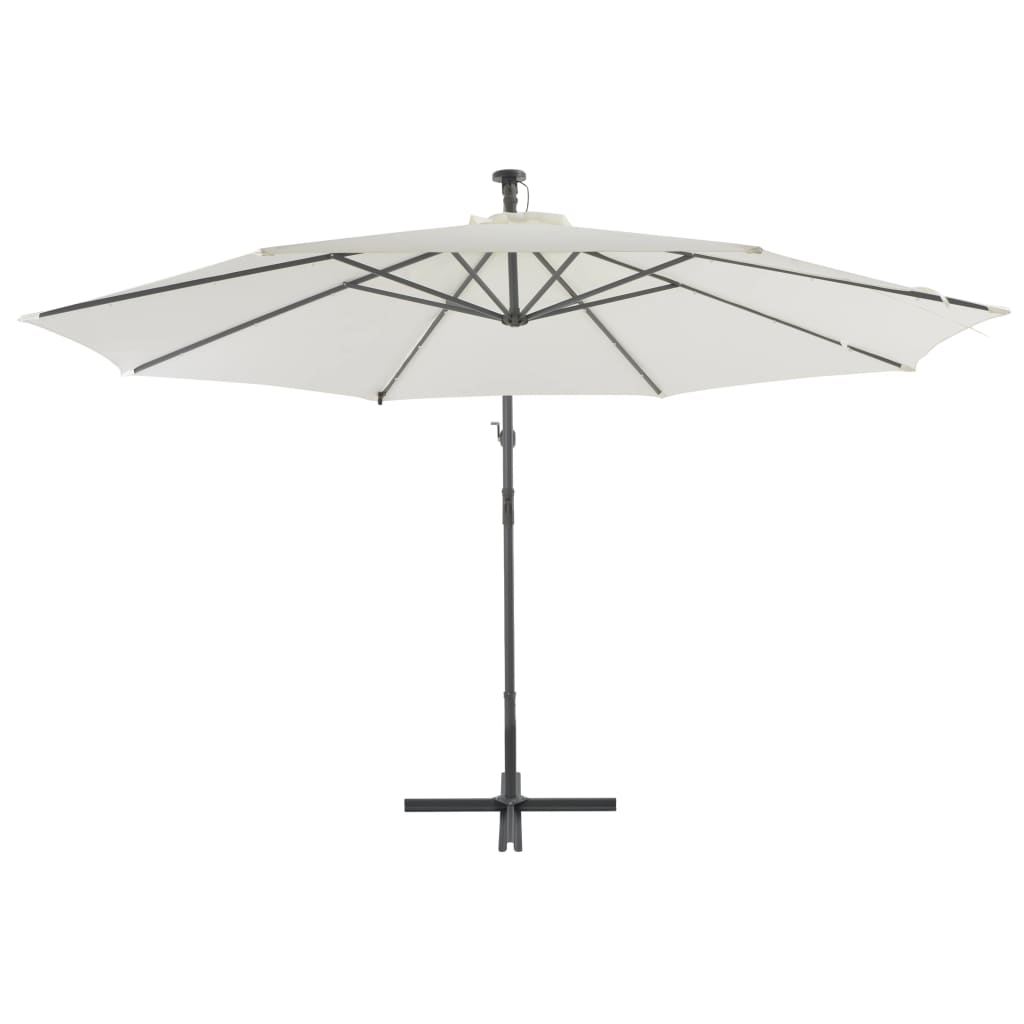 Dieser elegante Sonnenschirm mit LED schafft nicht nur ein schattiges Plätzchen in deinem Garten, sondern bietet auch Schutz gegen schädliche UV-Strahlen. Aus UV-beständigem und verblassfestem Polyester gefertigt, bietet dieser Sonnenschirm optimalen Schutz vor schädlichen Sonnenstrahlen und ist leicht zu reinigen. Er ist mit 24 solarbetriebenen LEDs ausgestattet, die Ihren Außenwohnbereich automatisch beleuchten und ein gemütliches und romantisches Ambiente schaffen, wenn die Sonne untergeht. Der Sonnenschirm ist außerdem mit einem stabilen Kreuzuß versehen, der für zusätzliche Stabilität sorgt. Das exklusive Design ermöglicht es Ihnen, den Sonnenschirm zu kippen, damit Sie sich vor der Sonne am Horizont schützen können. Der starke Metallmast und die 8 robusten Schirmrippen verleihen dem Ampelschirm Stabilität und Langlebigkeit. Unser Sonnenschirm lässt sich dank des Kurbelmechanismus einfach öffnen und schließen. Der Artikel ist leicht zu montieren. Bitte beachten: Wir empfehlen, die Schirmbespannung mit einem Imprägnierspray zu behandeln, wenn es starken Regenfällen ausgesetzt ist.