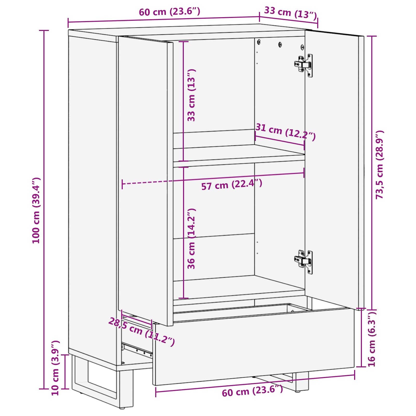 Dieses moderne Storage Highboard vereint Stil und Funktion. Es bietet viel Stauraum und beeindruckt mit einem minimalistischen Design. Entwickelt, um das Aussehen jedes Wohnzimmers oder Home Offices aufzuwerten, besticht es durch klare Linien und wenige Verzierungen. Die rechteckige Form und die glatte matte Oberfläche geben ihm einen eleganten Touch und ziehen alle an, die praktische Aufbewahrung in einem stilvollen Ambiente suchen. Massivholz Akazie & Metall: Mit hochwertigem Akazienholz strahlt der Highboard natürliche Schönheit aus und gewährleistet langlebige Qualität. Der stabile Metallrahmen sorgt für zusätzliche Stabilität und trägt verschiedene Gewichte. Diese Materialien sind nicht nur schön, sondern auch robust, sodass sie eine lohnende Investition sind. Funktionale Türen & Schubladen: Die klassischen Türen mit Scharnieren und praktischen Schubladen erhöhen die Funktionalität und sorgen für ordentliche Aufbewahrung. Jedes Element passt perfekt in die Einheit und öffnet sich zu großzügigen Innenräumen für Dokumente oder persönliche Sachen. Elegante Knöpfe erleichtern die Nutzung und verbessern das Erlebnis. Integrierte Regale: Der Highboard hat durchdachte Regallösungen, die eine vielseitige Nutzung ermöglichen. Egal ob Bücher, Deko oder Büromaterial – jedes Regal kann deinen Bedürfnissen angepasst werden. So kannst du eine ordentliche und funktionale Umgebung schaffen. Übergangsfreundliches Design: Es ist mehr als nur eine Aufbewahrungslösung; sein elegantes Design macht es zu einem wertvollen Teil jeder Einrichtung. Ob modern oder zeitgenössisch, sein flexibles Design passt gut und bietet sowohl ästhetische als auch praktische Vorteile, egal ob als Standalone-Stück oder im Set. Einfache Pflege: Die Pflege dieses Highboards ist unkompliziert: Einfach mit einem trockenen Tuch abwischen reicht aus, um es sauber zu halten. Vermeide scharfe Chemikalien, um die Oberfläche zu schonen und den matten Glanz sowie die robuste Struktur zu bewahren.