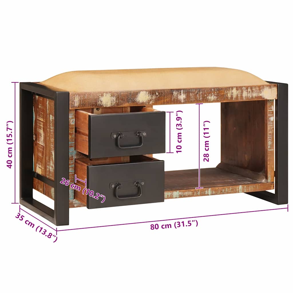 Diese Aufbewahrungsbank verbindet praktische Funktionalität mit einem auffälligen industriellen Stil und passt perfekt in deinen Flur oder dein Wohnzimmer. Die gepolsterte Oberseite sorgt für etwas Komfort und zeigt den einzigartigen Look des massiven recycelten Holzes, während die geräumigen Schubladen alles ordentlich halten. Die beiden klassischen Schubladen bieten easy Stauraum, damit du alles griffbereit hast und deinen Raum sauber hältst. Das Sitzkissen sorgt für einen bequemen Platz zum Entspannen, perfekt, um Gäste bei dir willkommen zu heißen. Aus massivem recyceltem Holz und pulverbeschichtetem Eisen gemacht, sorgen die stabilen Materialien dafür, dass dieses Stück in jedem Raum großartig aussieht. Der coole industrielle Stil dieser Bank passt zu vielen Dekorstilen, was sie top für moderne, rustikale oder eklektische Looks macht. Mit 80 cm in der Breite, 35 cm in der Tiefe und 40 cm in der Höhe bietet diese mittlere Bank locker Platz für zwei Personen und wertet jeden Flur oder Gang auf.