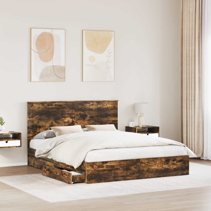 Dieser moderne Bettrahmen verbindet Ästhetik und Funktionalität. Mit seinem zeitgemäßen Look bietet er eine Balance aus Einfachheit und Praktikabilität – perfekt für alle, die eine schlichte, aber gezielte Ergänzung für ihr Schlafzimmer suchen. Mit seiner stabilen Holzwerkstoff-Konstruktion und dem schicken Kopfteil bringt er einen Hauch von Stil in jeden Raum. Wer moderne Designs liebt, findet in diesem Bett die ideale Mischung aus Form und Funktion. Gestell aus Holzwerkstoff : Dieser Bettrahmen ist aus solidem Holzwerkstoff gefertigt, das für seine Langlebigkeit bekannt ist. Es bietet eine zuverlässige Basis für den täglichen Gebrauch und bleibt zudem im Mittelpunkt deines modernen Zuhauses. Eingebaute Stauraumschubladen : Der Rahmen nutzt den Platz unter dem Bett optimal aus und hat praktische Schubladen mit Griffen, die genug Platz für Wäsche oder persönliche Dinge bieten. Dieses durchdachte Design ist ideal für alle, die Platz sparen und dabei stilvoll bleiben wollen. Einfache Montage : Der Bettrahmen ist so konzipiert, dass du ihn einfach aufbauen kannst – du brauchst nur zwei Personen und einen Schraubendreher. So wird der Aufbau zum Kinderspiel und du kannst dein neues Bett schnell nutzen, ohne dich mit komplizierten Anleitungen herumschlagen zu müssen. Modernes minimalistisches Design : Mit einem Fokus auf klare Linien und Funktionalität fügt sich dieser Rahmen mühelos in verschiedene Schlafzimmerstile ein. Seine schlichte Schönheit schafft eine einladende Atmosphäre für alle, die einen modernen Look ohne überflüssigen Schnickschnack möchten. Einfache Pflege : Du kannst diesen Bettrahmen problemlos pflegen, indem du ihn einfach mit einem feuchten Tuch reinigst. Diese einfache Pflegeanleitung erleichtert es, den guten Eindruck des Bettes zu bewahren, perfekt für einen vollen Lebensstil.