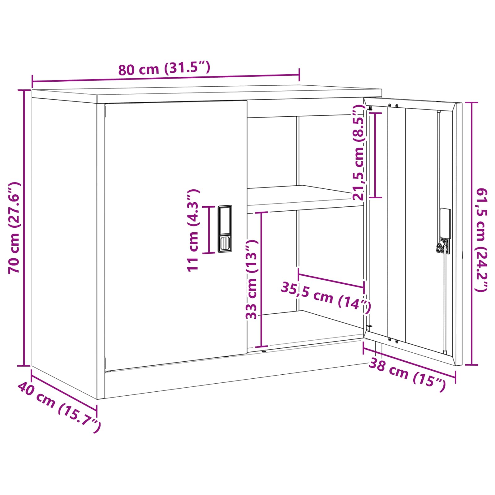 Dieser moderne Stauraumschrank bringt klare, elegante Linien und Funktionalität zusammen. Er ist die perfekte Ergänzung für jeden zeitgenössischen Raum. Aus kaltgewalztem Stahl gefertigt, bietet er nicht nur Stabilität, sondern setzt auch schicke metallische Akzente. Mit seinen durchdachten Details sorgt der abschließbare Schrank für Sicherheit deiner Wertsachen und hilft dir, Ordnung in deinem Büro oder Arbeitsbereich zu halten. Kaltgewalzter Stahl: Dieser Schrank ist aus robustem kaltgewalzten Stahl gemacht. Er bietet hohe Haltbarkeit und bleibt auch bei täglichem Gebrauch stabil. Das Material sieht nicht nur gut aus, sondern sorgt auch dafür, dass der Schrank lange hält und viele Dinge sicher aufbewahrt. Abschließbare Türen: Die Türen sind abschließbar und schützen deine wertvollen oder vertraulichen Dinge. Diese Eigenschaft ist besonders wichtig im Büro, wo Privatsphäre und Vertraulichkeit wichtig sind, oder zu Hause, wenn Kinder da sind. Industrielles & modernes Design: Die Kombination aus industriellen und modernen Designelementen verleiht deinem Raum einen coolen Touch. Die lackierte Oberfläche schützt vor Kratzern und sorgt für einen tollen Glanz, was den Schrank sowohl funktional als auch stylisch macht. Viel Stauraum: Mit viel Platz ist der Schrank ideal für alles, was du aufbewahren möchtest – seien es Büroartikel, Ordner oder persönliche Gegenstände. So wird die Organisation zum Kinderspiel! Einfache Pflege & Wartung: Der Schrank ist super pflegeleicht! Ein einfaches Abwischen mit einem feuchten Tuch reicht, um ihn sauber zu halten. Vermeide aggressive Chemikalien, damit die Oberfläche schön bleibt und der Schrank weiterhin im besten Licht dasteht.