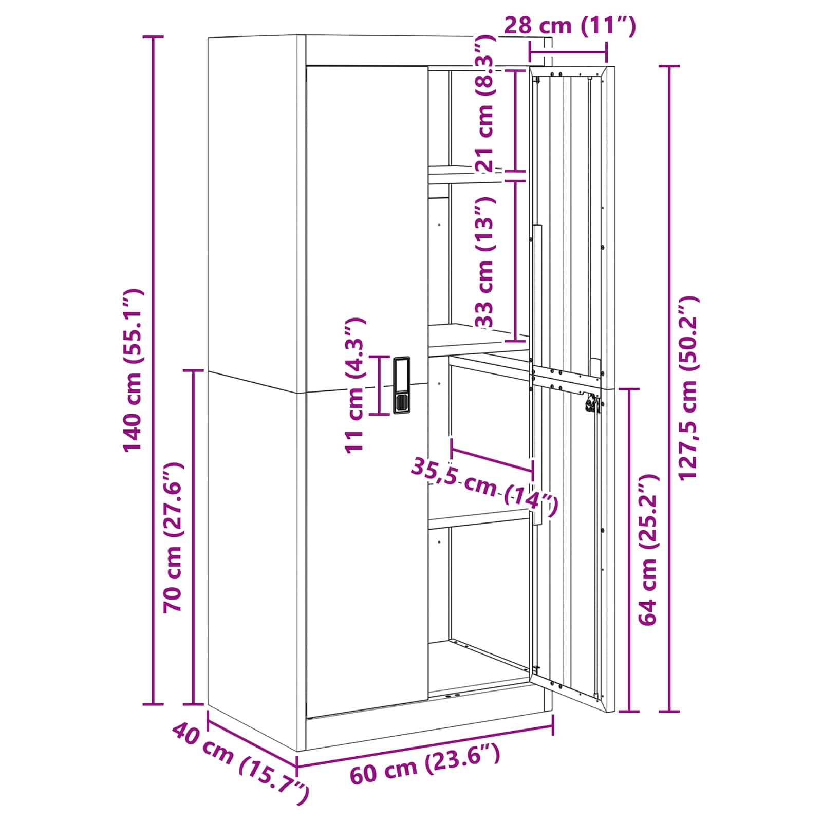 - Gesamtabmessungen: 60 x 40 x 140 cm (L x B x H)
