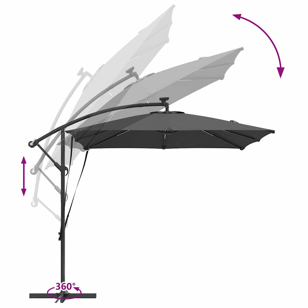 Dieser Outdoor Cantilever Sonnenschirm ist eine flexible Möglichkeit, Schatten für jeden modernen Außenbereich zu schaffen – egal ob Balkon, Garten oder Terrasse. Mit seinem schicken Design bietet er hervorragenden Sonnenschutz und bringt praktische Elemente sowie Stil in deine Sommer-Lounge. Das freischwingende Design erlaubt es dir, ihn nach Belieben zu positionieren, und sein stylisches Aussehen passt perfekt zu städtischen Umgebungen und sorgt für eine einladende Atmosphäre zum Entspannen oder Feiern mit Freunden. Material: Hergestellt aus robustem pulverbeschichtetem Stahl, ist der Sonnenschirm sowohl UV- als auch windfest. Das Polyesterdach hält den Elementen stand und schützt dich vor der Sonne, dabei sieht es auch noch schick aus. Coole Features: Mit solarbetriebenen LED-Leuchten für eine angenehme Abendstimmung und einem Handgriff zum schnellen Öffnen und Schließen, plus einer Kippfunktion, mit der du das Dach besser anpassen kannst. Er wurde für Komfort und Praktikabilität entwickelt und ist die perfekte Wahl für die Entspannung im Freien. Genialer Aufbau: Das windfeste Design sorgt dafür, dass er an windigen Tagen stabil bleibt, und die neigbare Struktur ermöglicht es dir, den Schatten ganz nach Wunsch zu justieren. Diese Flexibilität sorgt dafür, dass du immer draußen entspannen kannst – egal wo die Sonne steht, und maximiert den Einsatz von morgens bis abends. Vielseitig einsetzbar: Perfekt für jeden Außenbereich – ob Garten, Balkon oder Terrasse – bietet dieser Sonnenschirm vielseitigen Schatten. Ideal zum Chillen mit einem Buch, für eine Gartenparty oder für ein Essen unter den Sternen. Einfach zu pflegen: Für eine ansprechende Optik sprühe regelmäßig ein wasserdichtes Spray auf und benutze eine Abdeckung, wenn du ihn nicht nutzt. Regelmäßige Pflege hilft, ihn gut in Schuss zu halten und macht ihn zu einem langlebigen Element in deinem Außenbereich.