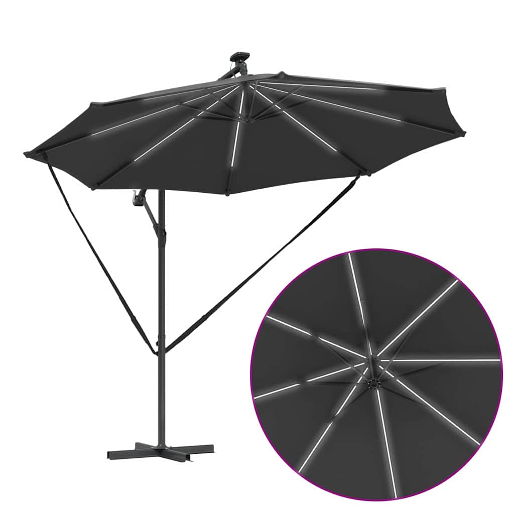 Dieser freistehende Sonnenschirm sorgt für eine stylische Atmosphäre in Außenbereichen wie Balkonen, Gärten und Terrassen. Er erhöht den Komfort und den Schutz an sonnigen Tagen mit seinem schlichten Design, der glatten Oberfläche und dem pulverbeschichteten Finish sowie einem UV-schutzbeschichteten Polyesterbezug. Wenn du auf Stil und Funktion Wert legst, ist dieser Schirm die perfekte Wahl. Stell dir vor, wie du gemütlich mit Freunden unter diesem großen Schattenspender sitzt, der jeden Bereich in etwas Besonderes verwandelt. Verstellbare Handkurbel: Dank der stylischen Handkurbel kannst du den Sonnenschirm ganz leicht öffnen und schließen. So kannst du die Höhe einstellen und genau den richtigen Schatten genießen, was dein Sitzen oder Essen im Freien viel angenehmer macht. Neigungssystem: Mit der eingebauten Neigungsfunktion kannst du den Schirm einfach anpassen, um optimalen Sonnenschutz zu erhalten. Dieses praktische Feature hilft dir, die Sonne aus den Augen zu halten, egal ob bei geselligen Treffen, beim Familienessen oder einfach nur zum Entspannen. LED-Beleuchtung: Die LED-Lichter an den Streben beleuchten deinen Außenbereich in der Nacht und sorgen für eine gemütliche Stimmung. Sie sind umweltfreundlich und energieeffizient, da sie mit Solarenergie betrieben werden, sodass du deine Abendausflüge genauso genießen kannst wie die am Tag. Pulverbeschichteter Stahl: Der Schirm hat einen stabilen Rahmen aus pulverbeschichtetem Stahl, der für die Ewigkeit gemacht ist. Die Beschichtung ist rost- und kratzfest, damit er bei jedem Wetter gut aussieht. Wasserabweisender Stoff: Der Polyesterbezug ist langlebig und wasserabweisend, sodass du trocken bleibst, selbst wenn plötzlich ein paar Tropfen fallen. So sieht der Schirm frisch aus und schützt deinen Sitzbereich.