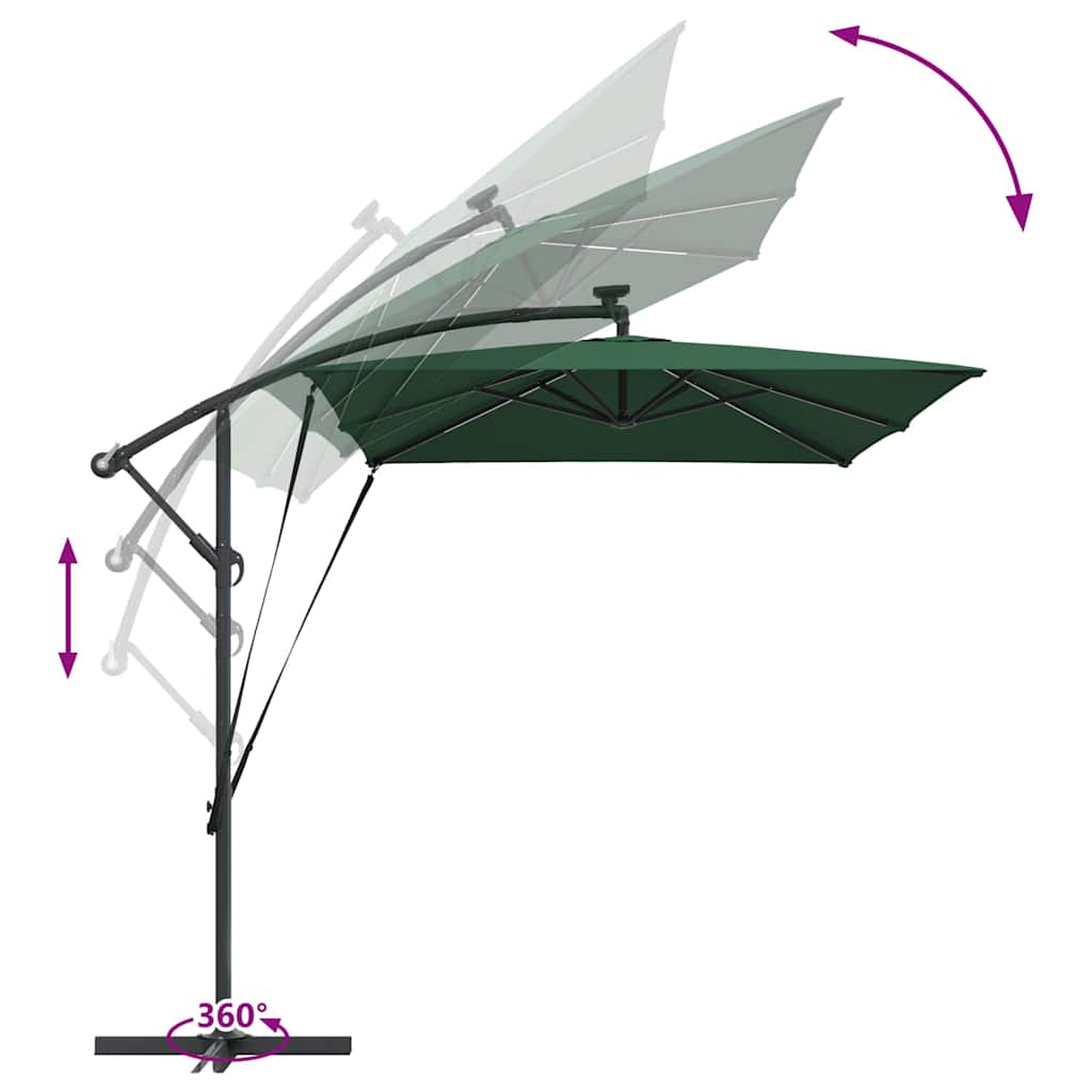 Der freischwingende Sonnenschirm vereint stylische Praktikabilität und ist perfekt, um deinen Garten, Balkon oder deine Terrasse aufzupimpen. Mit seinem modernen, schlichten Design passt er überall rein. Sein eleganter Look und die glatte Oberfläche machen ihn nicht nur schön, sondern bieten auch verlässlichen Schatten – ideal zum Chillen oder für Partys mit Freunden. Materialien: Aus pulverbeschichtetem Stahl, stabil und rostfrei. Das Polyester-Dach bietet tollen UV-Schutz und bleibt bei jedem Wetter fresh. Er ist für lange Lebensdauer und gute Leistung gemacht. Enthaltene Komponenten: Mit solarbetriebenen LED-Lichtern, die nachts für schönes Licht sorgen, ohne Stromkosten. Die praktische Handkurbel macht das Öffnen und Schließen super einfach, und die kippbare Funktion lässt sich problemlos anpassen. Features / Funktion / Design: Winddicht, also keine Sorge bei windigem Wetter. Der Luftschlitz sorgt dafür, dass die Luft zirkuliert und das Dach nicht umgedreht wird. Mit den solarbetriebenen Lichtern schaffst du eine tolle Atmosphäre, perfekt zum Abhängen oder Essen am Abend. Empfohlene Anwendungen: Ideal für Gärten, Balkone und Terrassen. Eine tolle Lösung für jeden Außenanlass. Ob Tag oder Nacht, der Schirm ist super für alles – vom entspannten Chillen bis zu lebhaften Partys. Pflege & Wartung: Um deinen Schirm schön zu halten, vermeide scharfe Reiniger und verwende eine Abdeckung, wenn er nicht gebraucht wird. Ein bisschen wasserabweisendes Spray ab und zu hilft, ihn gegen Feuchtigkeit zu schützen.