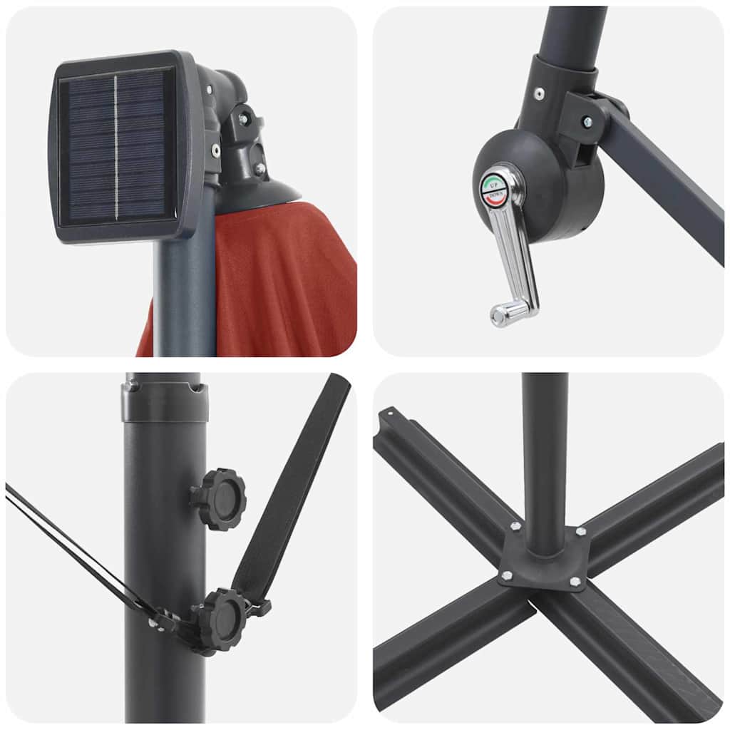 Der freischwingende Sonnenschirm vereint stylische Praktikabilität und ist perfekt, um deinen Garten, Balkon oder deine Terrasse aufzupimpen. Mit seinem modernen, schlichten Design passt er überall rein. Sein eleganter Look und die glatte Oberfläche machen ihn nicht nur schön, sondern bieten auch verlässlichen Schatten – ideal zum Chillen oder für Partys mit Freunden. Materialien: Aus pulverbeschichtetem Stahl, stabil und rostfrei. Das Polyester-Dach bietet tollen UV-Schutz und bleibt bei jedem Wetter fresh. Er ist für lange Lebensdauer und gute Leistung gemacht. Enthaltene Komponenten: Mit solarbetriebenen LED-Lichtern, die nachts für schönes Licht sorgen, ohne Stromkosten. Die praktische Handkurbel macht das Öffnen und Schließen super einfach, und die kippbare Funktion lässt sich problemlos anpassen. Features / Funktion / Design: Winddicht, also keine Sorge bei windigem Wetter. Der Luftschlitz sorgt dafür, dass die Luft zirkuliert und das Dach nicht umgedreht wird. Mit den solarbetriebenen Lichtern schaffst du eine tolle Atmosphäre, perfekt zum Abhängen oder Essen am Abend. Empfohlene Anwendungen: Ideal für Gärten, Balkone und Terrassen. Eine tolle Lösung für jeden Außenanlass. Ob Tag oder Nacht, der Schirm ist super für alles – vom entspannten Chillen bis zu lebhaften Partys. Pflege & Wartung: Um deinen Schirm schön zu halten, vermeide scharfe Reiniger und verwende eine Abdeckung, wenn er nicht gebraucht wird. Ein bisschen wasserabweisendes Spray ab und zu hilft, ihn gegen Feuchtigkeit zu schützen.