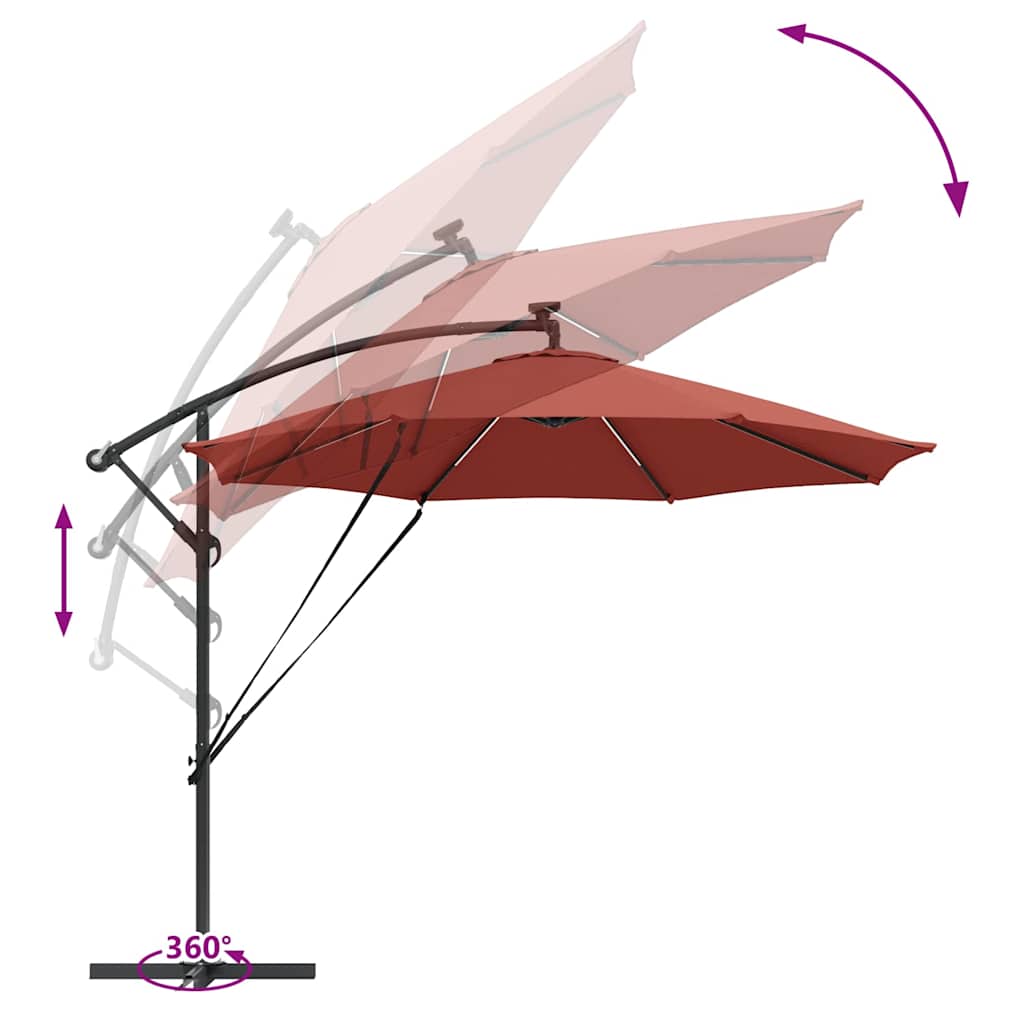 Dieser freistehende Sonnenschirm sorgt für eine stylische Atmosphäre in Außenbereichen wie Balkonen, Gärten und Terrassen. Er erhöht den Komfort und den Schutz an sonnigen Tagen mit seinem schlichten Design, der glatten Oberfläche und dem pulverbeschichteten Finish sowie einem UV-schutzbeschichteten Polyesterbezug. Wenn du auf Stil und Funktion Wert legst, ist dieser Schirm die perfekte Wahl. Stell dir vor, wie du gemütlich mit Freunden unter diesem großen Schattenspender sitzt, der jeden Bereich in etwas Besonderes verwandelt. Verstellbare Handkurbel: Dank der stylischen Handkurbel kannst du den Sonnenschirm ganz leicht öffnen und schließen. So kannst du die Höhe einstellen und genau den richtigen Schatten genießen, was dein Sitzen oder Essen im Freien viel angenehmer macht. Neigungssystem: Mit der eingebauten Neigungsfunktion kannst du den Schirm einfach anpassen, um optimalen Sonnenschutz zu erhalten. Dieses praktische Feature hilft dir, die Sonne aus den Augen zu halten, egal ob bei geselligen Treffen, beim Familienessen oder einfach nur zum Entspannen. LED-Beleuchtung: Die LED-Lichter an den Streben beleuchten deinen Außenbereich in der Nacht und sorgen für eine gemütliche Stimmung. Sie sind umweltfreundlich und energieeffizient, da sie mit Solarenergie betrieben werden, sodass du deine Abendausflüge genauso genießen kannst wie die am Tag. Pulverbeschichteter Stahl: Der Schirm hat einen stabilen Rahmen aus pulverbeschichtetem Stahl, der für die Ewigkeit gemacht ist. Die Beschichtung ist rost- und kratzfest, damit er bei jedem Wetter gut aussieht. Wasserabweisender Stoff: Der Polyesterbezug ist langlebig und wasserabweisend, sodass du trocken bleibst, selbst wenn plötzlich ein paar Tropfen fallen. So sieht der Schirm frisch aus und schützt deinen Sitzbereich.