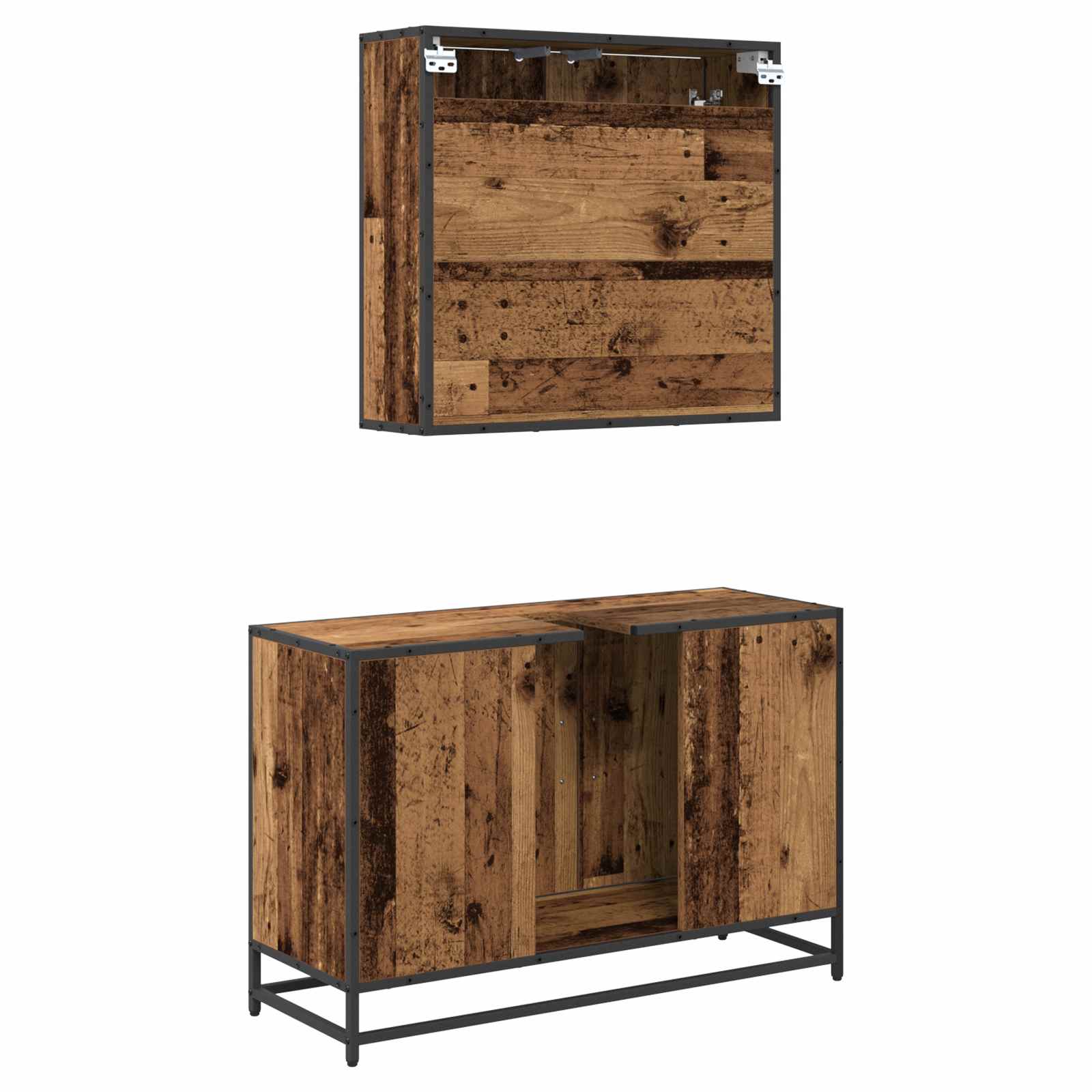 Dieses Holz Badezimmermöbelset steht für modernes Design mit klaren Linien und einem minimalistischen Look. Die Kombination aus Holzwerkstoff und Metall macht es sowohl praktisch als auch stylish und ist eine tolle Ergänzung für jedes Bad. Es beinhaltet einen hängenden Spiegelschrank und einen unterteilten Waschtischschrank, die Funktionalität und Eleganz perfekt in Einklang bringen. Egal, ob du dein Bad neu gestalten oder bestehende Möbel aufpeppen willst, dieses Set bietet einen sleek Look, der deinen Alltag im Badezimmer besser macht. Rechteckige Form: Der rechteckige Spiegelschrank passt super in moderne Räume und harmoniert perfekt mit anderen geometrischen Designs. Die klaren Linien bringen eine minimalistische Ästhetik, die zu vielen Stilrichtungen passt, von modern bis zeitgenössisch. Viel Stauraum: Der Waschtischschrank mit Unterteilungen bietet viel Platz für persönliche Dinge, Kosmetika und Handtücher. Die bündigen Türen und langen Eisengriffe helfen, den Raum zu maximieren und Unordnung zu vermeiden. Wandmontiertes Design: Der Spiegelschrank wird an der Wand montiert und spart so wertvollen Platz, was ihn perfekt für kleine Badezimmer macht. Dadurch bleibt der Boden frei und es hilft, ein ordentliches Ambiente zu schaffen. Robuste Konstruktion: Aus Holzwerkstoff und stabilem Metall gefertigt, bietet dieses Set Langlebigkeit ohne Abstriche beim Stil. Die Materialien sind so gewählt, dass sie Feuchtigkeit und täglicher Abnutzung standhalten, was eine lange Nutzung ermöglicht. Einfache Pflege: Ein schneller Wisch mit einem feuchten Tuch genügt, um das Möbelset in einem tollen Zustand zu halten. So bleibt es schön wie am ersten Tag, ohne viel Aufwand für die Pflege.