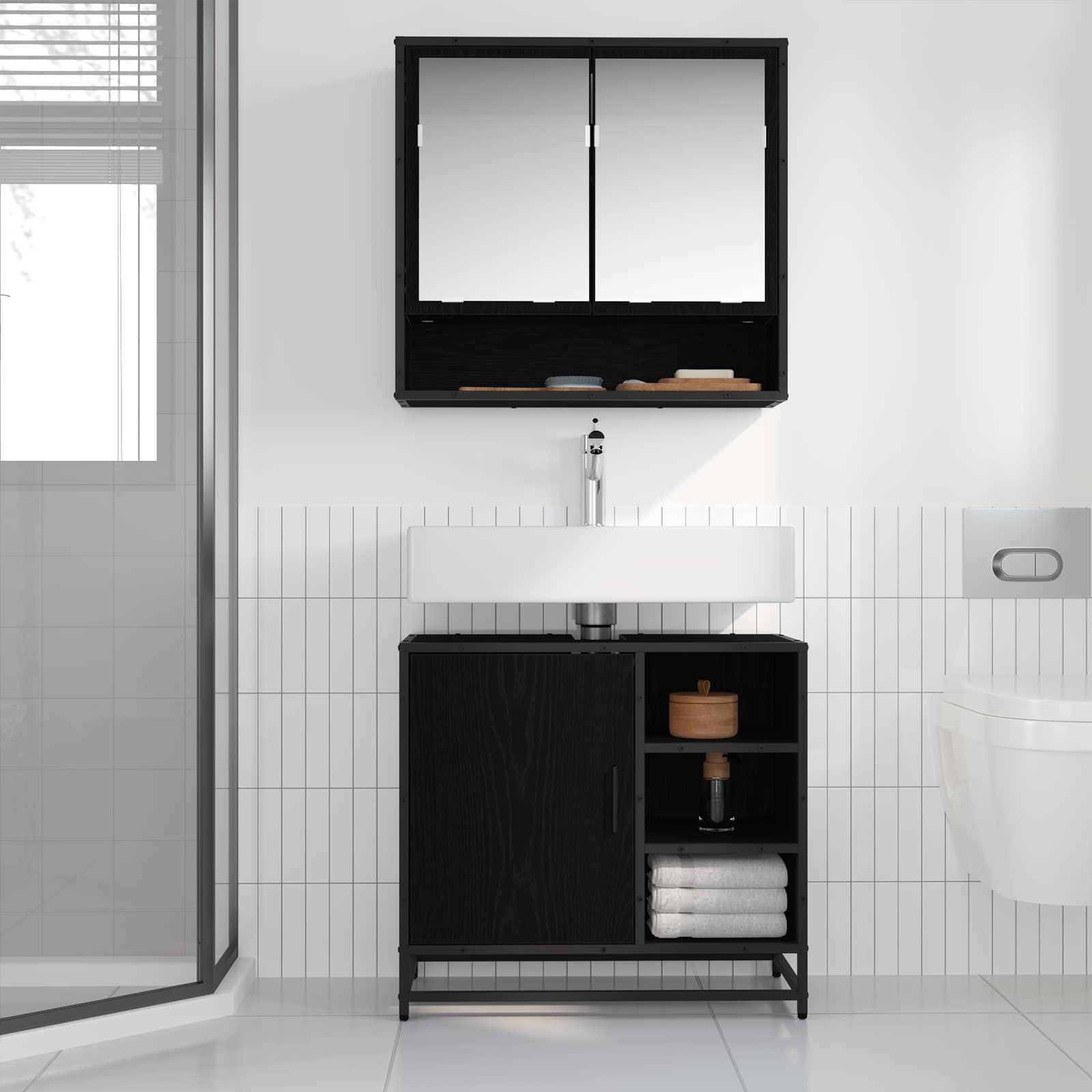 Dieses moderne Badmöbel-Set bringt Stil und Funktionalität zusammen und verwandelt dein Badezimmer in einen schlichten, geordneten Raum. Mit einem minimalistischen Look hat es klare Linien und strahlt eine schicke, zeitgenössische Atmosphäre aus, die ideal für moderne Häuser ist. Es trifft die Bedürfnisse von Leuten, die praktische und elegante Badezimmermöbel suchen. Mit seinem stilvollen Design ist dieses Set das perfekte Zentrum, das deinen Alltag aufwertet. Materialien: Das Set besteht zum Großteil aus Holzwerkstoff, der stabil genug für den täglichen Gebrauch ist und dabei echt schick aussieht. Diese Materialwahl sorgt für ein gutes Verhältnis von Preis und Qualität und garantiert langfristige Nutzung und Stil. Der flache Spiegel passt super gut zum modernen Look. Eingeschlossene Komponenten: Im Paket sind ein Spiegelschrank (65 x 20 x 60 cm), ein Waschbeckenunterschrank (90 x 33 x 60 cm) und ein Badschrank (37,5 x 35 x 100 cm) enthalten – perfekt für all deine Toilettenartikel. Jeder Schrank ist klug entworfen, um verschiedene Aufbewahrungsbedürfnisse zu bedienen und passt gut zum restlichen Badezimmerdesign. Merkmale / Funktion / Design: Das Set hat einen wandmontierten Stil, der Platz spart und dem Raum ein elegantes Erscheinungsbild verleiht. Die flush Türen und Stangengriffe steigern die Eleganz und die klaren Linien des Designs, sodass die Schränke sowohl praktikabel als auch schön aussehen. Empfohlene Verwendung: Besonders empfehlenswert für städtische Badezimmer, wo Platzoptimierung wichtig ist – das Set sorgt für ein ordentliches Umfeld. Es eignet sich gut für Badezimmer in Wohnungen, Neubauten oder Renovierungen, die einen modernen Look haben wollen. Pflege & Wartung: Um die Lebensdauer des Sets zu verlängern, einfach regelmäßig mit einem feuchten Tuch abwischen, um Staub und Flecken zu entfernen. Gute Pflege sorgt dafür, dass die Möbel ihren Glanz und ihre Funktionalität behalten, ohne viel Aufwand zu erfordern.