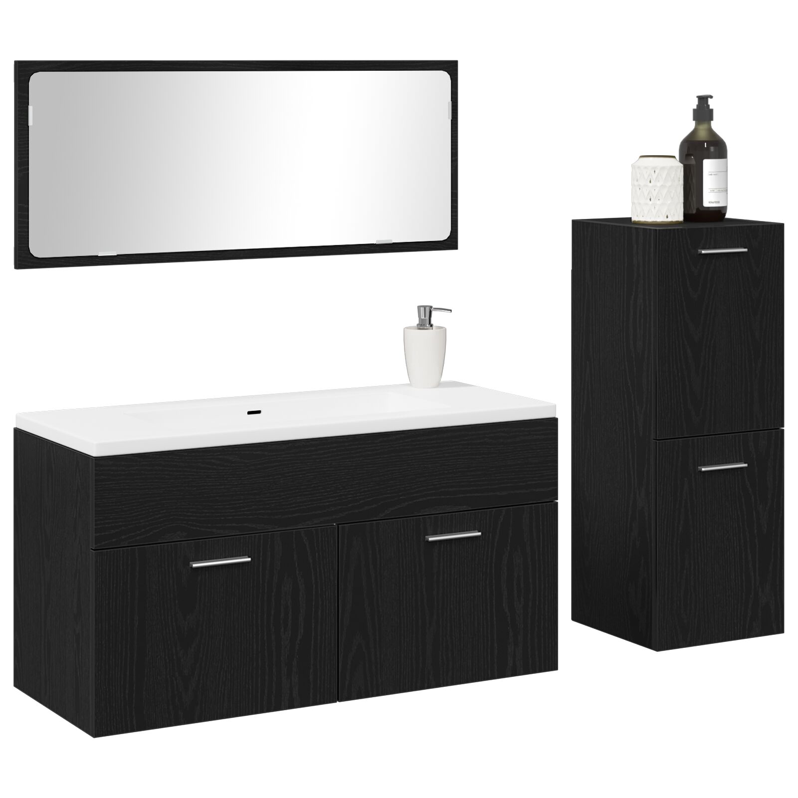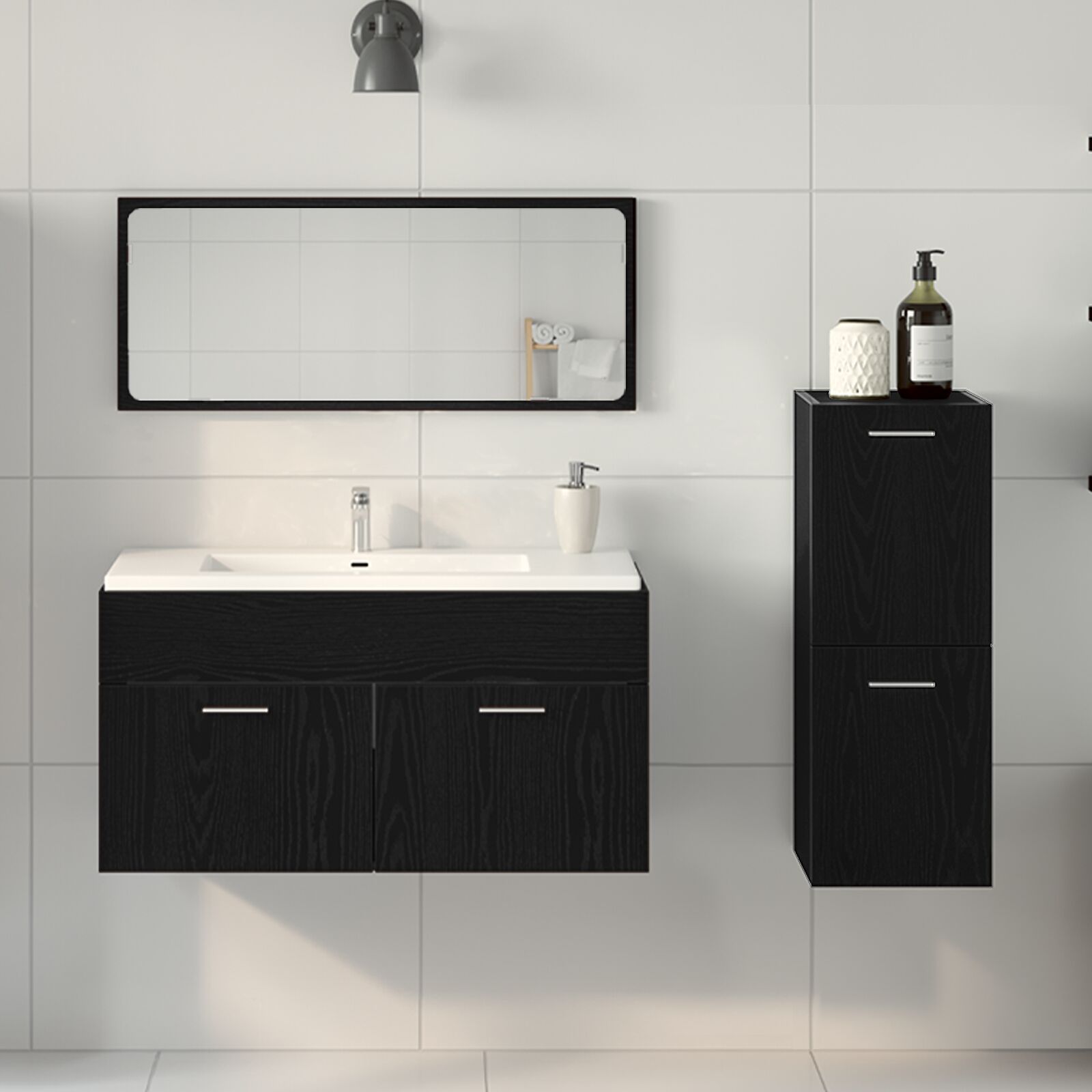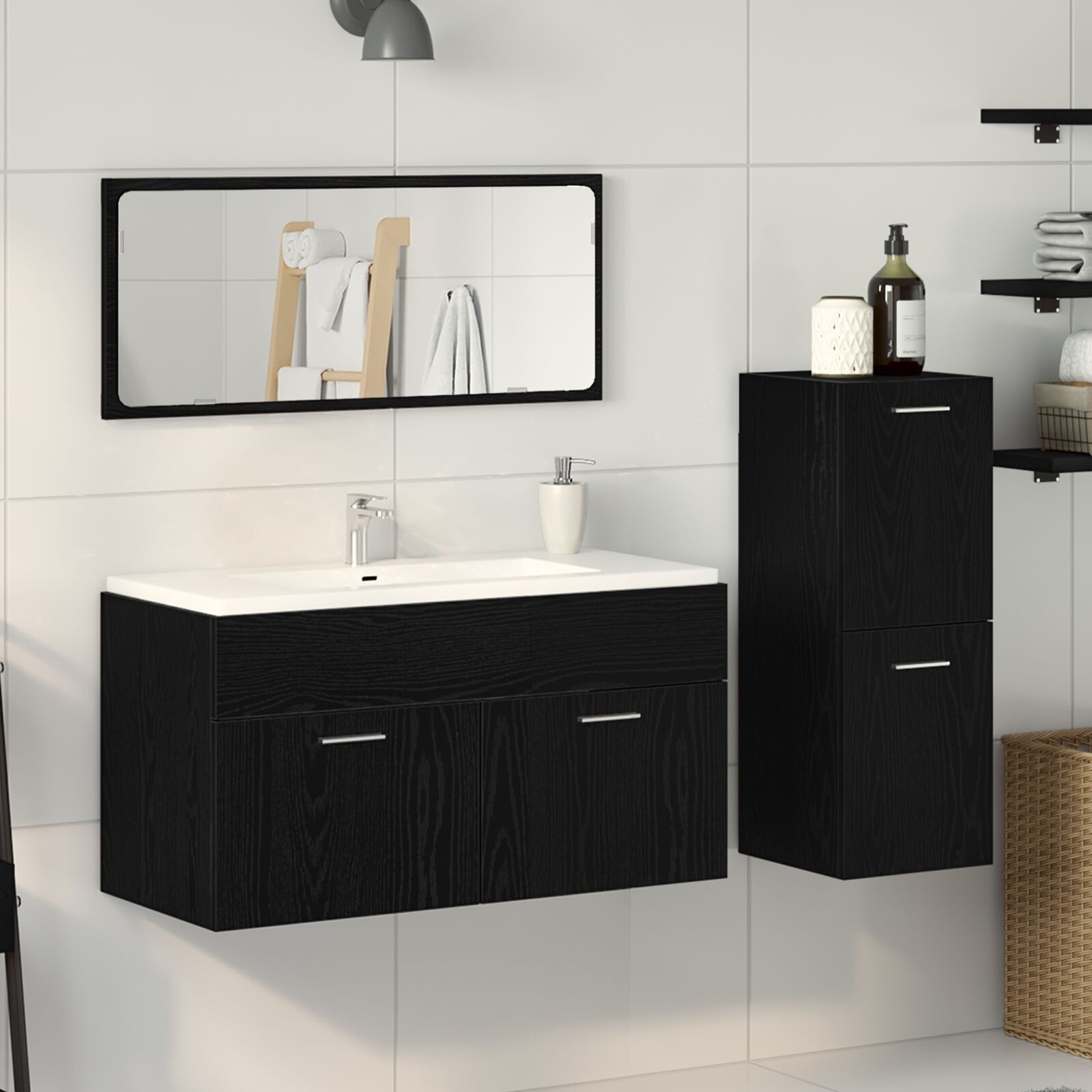 Gnn deinem Badezimmer einen frischen Look mit diesem modernen Set aus schwarzer Eiche. Es vereint Stil und Funktionalitt und bringt einen neuen Flair in deinen Raum. Jedes Teil von diesem Set hat viel Platz zu bieten und sieht modern aus perfekt fr Minimalisten und alle, die einen klassischen Touch mgen. Aus robustem, strukturiertem Holz gefertigt, ist das Set ideal fr jeden Tag und praktisch fr Familien, die zustzlichen Stauraum brauchen. Das wandmontierte Design spart Platz auf dem Boden und sorgt fr einen aufgerumten Eindruck. Mit den Maen 90 x 38,5 x 46 cm passt es gut in kleinere Rume und bietet gengend Platz fr deine Toilettenartikel. Wenn du dein Badezimmer neu gestalten mchtest, ist dieses Set die perfekte Wahl und erfllt alle Anforderungen.