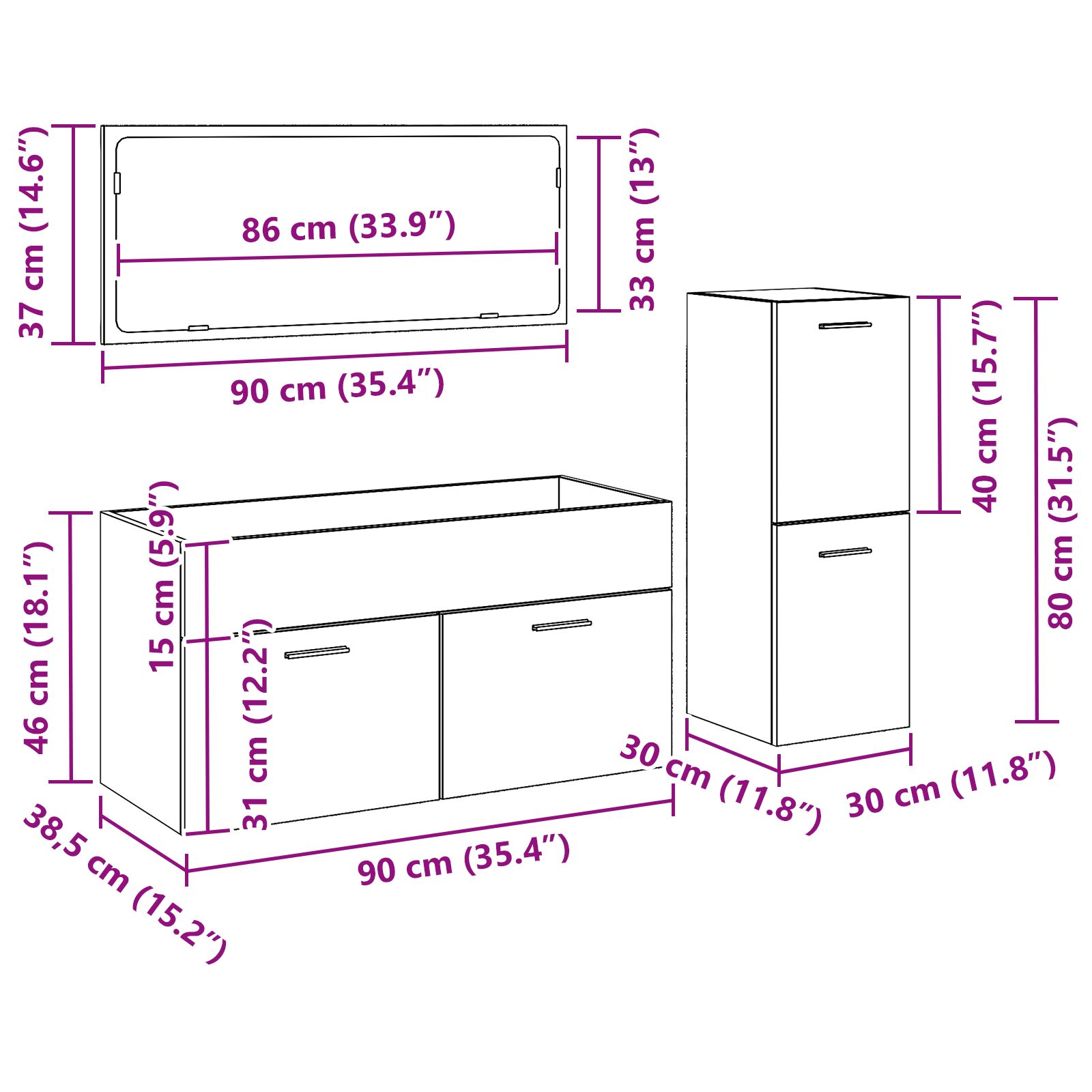 - Lieferumfang: 1 x Spiegel, 1 x Waschbeckenunterschrank, 1 x Mittelwertschrank