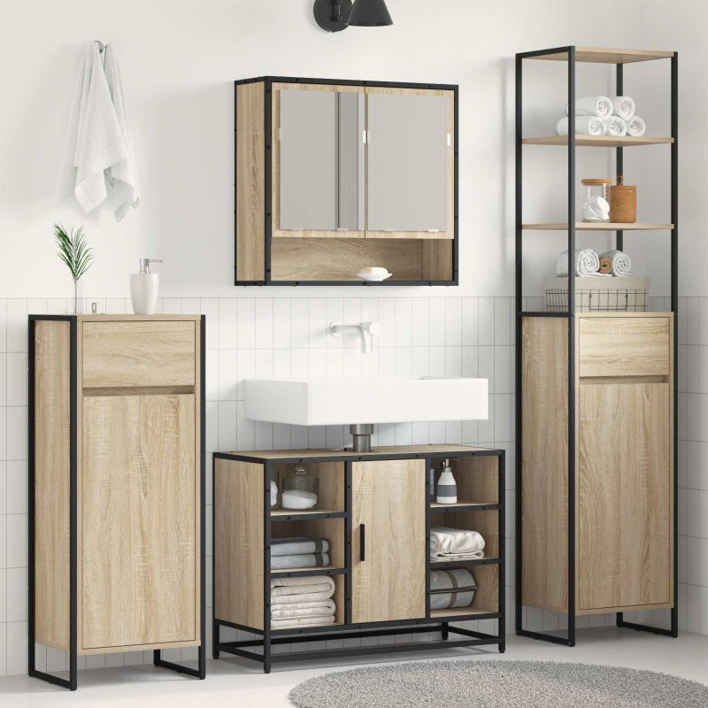 Dieser Industriedesign-Badschrank ist die perfekte Lösung für stilvolles und modernes Aufbewahren in jedem Badezimmer. Die rechteckige Form spiegelt zeitgemäßen Stil wider. Hergestellt aus Holzwerkstoff, verbindet er schickes Aussehen mit toller Funktionalität und ist ideal für diverse Badezimmer-Styles. So hast du die Möglichkeit, deine Utensilien ordentlich zu verstauen und den Raum aufgeräumt zu halten. Hochwertiger Holzwerkstoff: Der Schrank besteht aus qualitativ hochwertigem Holzwerkstoff, der für seine Widerstandsfähigkeit und schicke Optik ausgewählt wurde. So bleibt er eine zuverlässige Aufbewahrungslösung und sieht dazu noch gut aus – perfekt für jedes moderne Bad. Robuste Konstruktion: Der stabile Aufbau sorgt dafür, dass der Schrank dir über Jahre hinweg treu bleibt. Die Kombination aus Holzwerkstoff und Stahlbeinen gibt ihm den nötigen Halt für den Alltag im Badezimmer. Effiziente Aufbewahrungsmöglichkeiten: Mit viel Platz für deine Sachen organisiert dieser Schrank alles superschnell. Die cleveren Regale sorgen dafür, dass du alles zeitsparend verstauen kannst und immer einen klaren Überblick behältst. Einfache Montageanforderungen: Der Schrank wird von zwei Personen mit einem Schraubendreher aufgebaut. Der Aufbau ist einfach und sorgt dafür, dass er stabil steht, wenn er montiert ist. Ausgeliefert wird 1 x Badschrank. Pflegehinweise: Um den Schrank in Top-Zustand zu halten, wisch ihn einfach mit einem feuchten Tuch ab. Regelmäßige Pflege hält seine schicke Optik und bringt Frische in dein Bad.