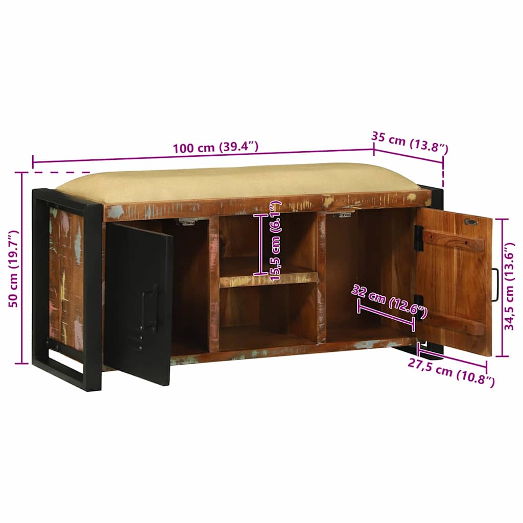 Hier ist die Stauraumbank, ein echt schickes Möbelstück, das rustikalen Charme mit modernem Stil vereint. Ideal für Bereiche, wo der Platz zählt. Diese Bank erfüllt praktische Anforderungen und bringt zugleich Stil in dein Zuhause. Viel Stauraum: Großer interner Stauraum mit zwei Fächern, perfekt zum Ordnen von Schuhen, Taschen und anderen Sachen. Langlebige Konstruktion: Aus solidem wiederverwertetem Holz und einem Metallrahmen gefertigt, sorgt sie für dauerhafte Stärke und Charakter. Bequeme Sitzgelegenheit: Mit einem weichen Schaumstoffkissen ausgestattet, das bequem ist, ideal für vielbesuchte Bereiche. Vielseitige Nutzung: Ihr rustikaler Stil passt zu jeder Art von Deko und macht sie in vielen Bereichen deines Zuhauses toll. Einfache Pflege: Regelmäßiges Abstauben hält sie lange frisch und in Form.