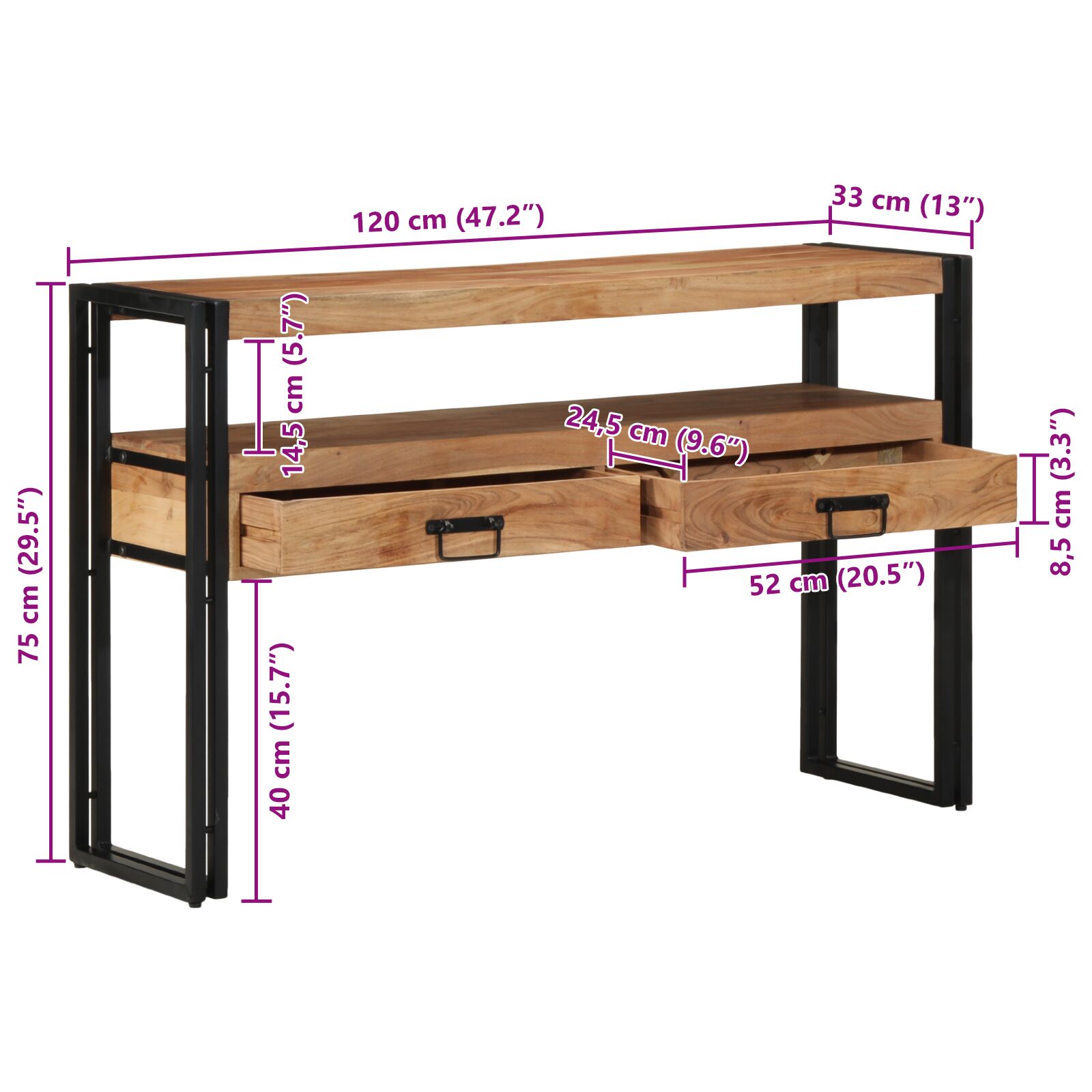 Beistelltische Schwarz 120x33x75 cm aus massivem Akazienholz und Metall