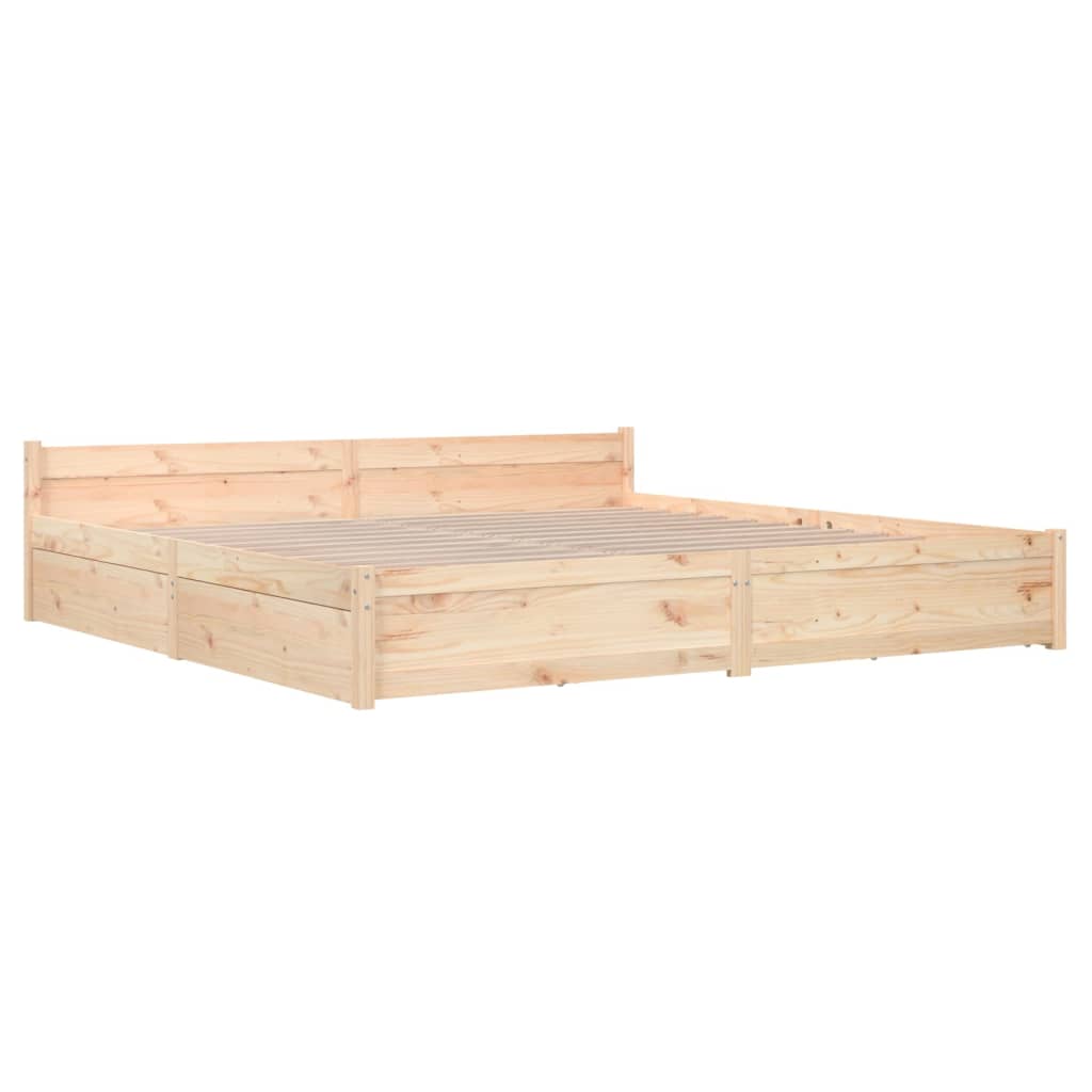 Verleihe deinem Schlafzimmer eine moderne Note mit diesem klassischen Bettgestell aus Holz! Es ist eine praktische und dekorative Bereicherung für dein Interieur. Massives Kiefernholz: Massives Kiefernholz ist ein wunderschönes Naturmaterial. Kiefernholz weist eine gerade Maserung auf und die Aststellen verleihen dem Material seine charakteristische, rustikale Optik.Robuste Latten: Die Sperrholzlatten sorgen für eine gute Gewichtsverteilung und auch dafür, dass die Matratze bei jeder Bewegung Ihres Körpers während des Schlafes an Ort und Stelle bleibt.Stauraum: Die mitgelieferten Bettschubladen bietet reichlich Stauraum zur Aufbewahrung wichtiger Sachen, um für Ordnung in Ihrem Zimmer zu sorgen.Komfortables Kopfteil: Am klassischen Kopfteil können Sie sich beim Lesen oder Fernsehen bequem zurücklehnen und entspannen. Hinweis:Die Lieferung umfasst nur einen Bettrahmen. Die Matratze ist nicht im Lieferumfang enthalten. Die passenden Matratzen finden Sie in unserem Shop.Dieser Bettrahmen ist für eine Matratze mit den Maßen 200x200 cm geeignet.