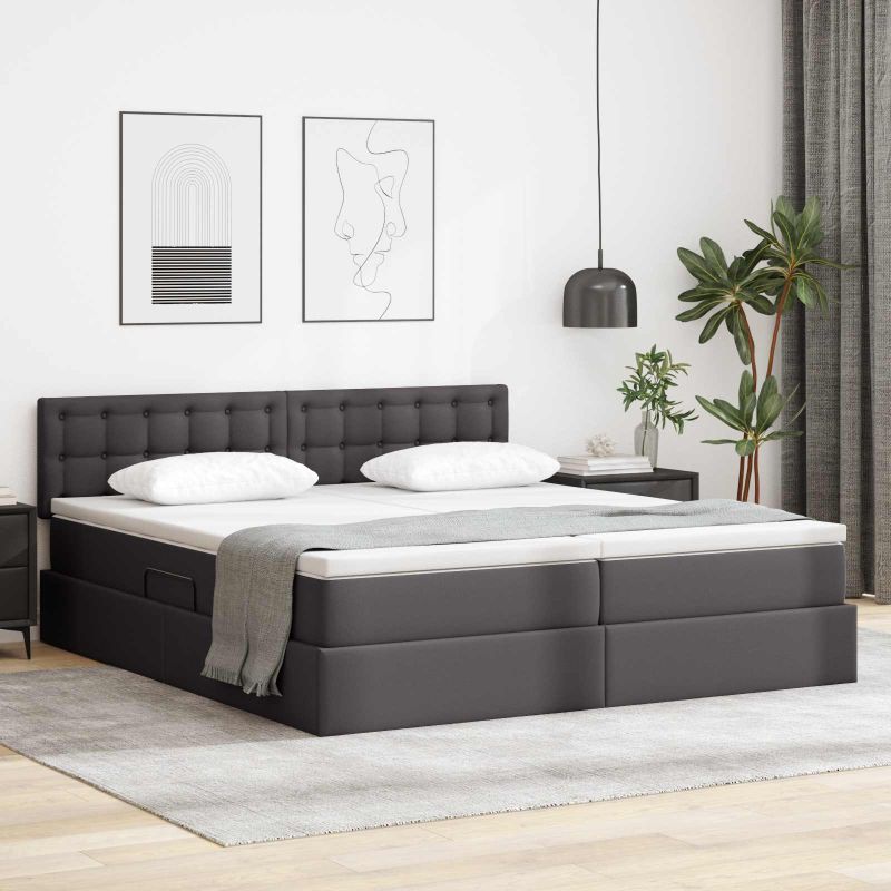 Dieses geniale Stauraumbett mit Matratze bietet eine schicke Lösung für moderne Wohnräume, wo Stil und Funktionalität aufeinandertreffen. Mit klaren Linien und einem minimalistischen Ansatz passt dieses Möbelstück perfekt in jeden zeitgemäßen Schlafraum. Es ist ideal für alle, die den Raum optimal nutzen wollen, ohne auf Stil zu verzichten, und bietet clevere Funktionen mit verstecktem Stauraum unter dem Bett. Die Kunstlederoberfläche sorgt für einen luxuriösen Touch und macht es zu einem echten Hingucker, perfekt zum Entspannen. Kunstlederpolsterung: Das schicke Kunstleder umhüllt den Bettrahmen und das Kopfteil, bietet einen sanften Griff und die ansprechende Optik von Leder. Es ist strapazierfähig und sieht auch nach täglichem Gebrauch gut aus – die moderne Optik unterstützt jede Schlafzimmergestaltung. Großer Stauraum unter dem Bett: Mit einem hydraulischen Hebesystem kommt ein großzügiger Stauraum unter der Matratze zum Vorschein. Dieser praktische Platz ist ideal für Bettwäsche, persönliche Dinge oder saisonale Kleidung, ladet die Effizienz des Raums auf. Der Gaslift funktioniert geschmeidig und macht den täglichen Gebrauch ganz unkompliziert. LED-Ambiente-Beleuchtung: Mit USB-betriebenen LED-Streifen hat das Bett eine elegante Beleuchtungslösung, die für sanftes Nachtlicht sorgt oder deinem Schlafzimmer eine coole Note verleiht. Die flexiblen LEDs bieten verschiedene Lichtintensitäten und garantieren eine angenehme Atmosphäre, die auf deine Stimmung abgestimmt ist. Mittelfeste Matratze: Die Matratze bietet die perfekte Balance aus Unterstützung und Komfort. Sie kombiniert Schaumstoff mit Taschenfedern, um die Bewegungsübertragung zu minimieren. So schläfst du ruhig und bequem, egal in welcher Position, und das Design erfüllt die unterschiedlichen Komfortbedürfnisse aller Schlafenden. Modernes Design: Mit einem schwarzen Rahmen hat das Bett ein modernes und stilvolles Aussehen, das zu eleganten Designs passt. Die rechteckige Form sorgt für ein klaren Look und eine saubere Atmosphäre, die durch funktionale Aspekte wie den erhöhten Stauraum und die intelligenten Beleuchtungsfunktionen ergänzt wird.