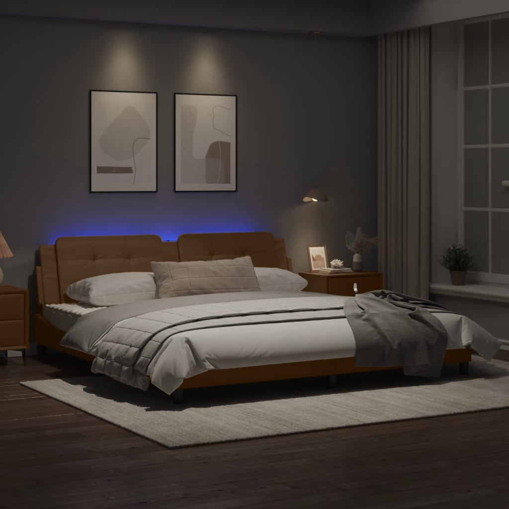 Dieses Bettgestell mit LED-Leuchten sorgt für eine erholsame Nachtruhe! Es stellt eine einladende Ergänzung zu jedem Schlafzimmer dar. Langlebiges Kunstleder: Hochwertiges Kunstleder ist ein äußerst langlebiges Material. Es ist schmutzabweisend und lässt sich mit einem feuchten Tuch einfach reinigen. Durch die glatte Oberfläche weist es die Schönheit von Echtleder und einen luxuriösen Look auf.Sperrholzlatten: Die Sperrholzlatten sorgen für eine gute Gewichtsverteilung und auch dafür, dass die Matratze bei jeder Bewegung deines Körpers während des Schlafes an Ort und Stelle bleibt.Hervorragende Unterstützung: Das Bett-Kopfteil bietet dir eine hervorragende Unterstützung, während du im Bett sitzt, um zu lesen oder fernzusehen.Bunter LED-Streifen: Die farbenfrohen LED-Leuchten bringen das Schlafzimmer zum Leuchten! Die Klettverschlüsse auf der Rückseite des Kopfteils können zur Befestigung der LED-Leuchten verwendet werden.Wellenförmiges Seitendesign: Das stilvolle und raffinierte Design in Wellenform verleiht deiner Einrichtung eine moderne und elegante Note und macht das Bettgestell zum Mittelpunkt deines Schlafzimmers. Gut zu wissen:Bei diesem Bett ist keine Matratze im Lieferumfang enthalten. Wir bieten jedoch eine große Auswahl an Matratzen an. Du kannst in unserem Shop nach einer passenden Matratze suchen.Das Produkt verfügt über einen USB-Anschluss, für den eine zertifizierte 5V-USB-Stromquelle erforderlich ist (nicht im Lieferumfang enthalten).