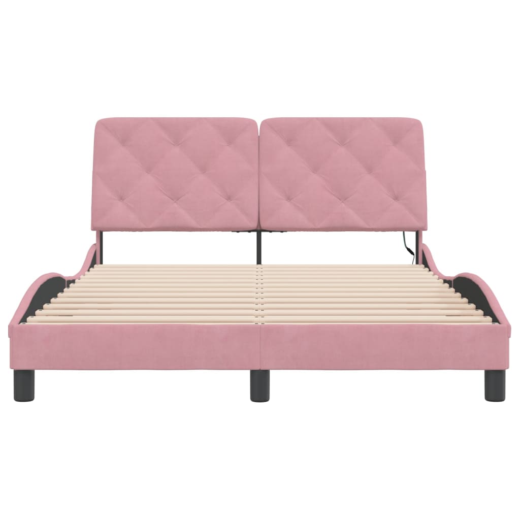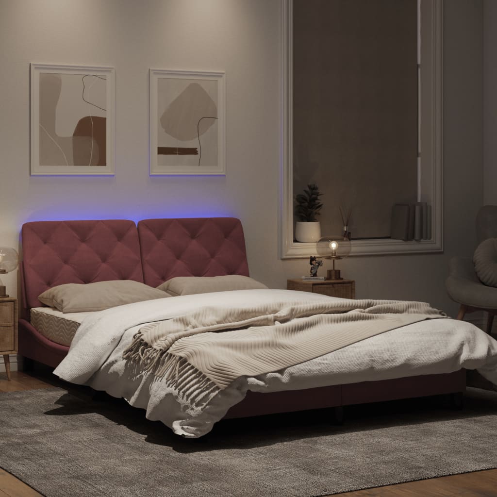 Dieses Bettgestell mit LED-Leuchten sorgt für eine erholsame Nachtruhe! Es stellt eine einladende Ergänzung zu jedem Schlafzimmer dar. Weicher Samt: Samt ist ein weicher und bequemer Stoff, der sich angenehm auf der Haut anfühlt. Sperrholzlatten: Die Sperrholzlatten sorgen für eine gute Gewichtsverteilung und auch dafür, dass die Matratze bei jeder Bewegung deines Körpers während des Schlafes an Ort und Stelle bleibt. Ausgezeichnete Unterstützung: Das Kopfteil-Kissen ist mit Schaumstoff gefüllt und fühlt sich daher extra weich und komfortabel an. Es bietet eine ausgezeichnete Rückenunterstützung beim Sitzen im Bett oder Fernsehen. Bunter LED-Streifen: Die farbenfrohen LED-Leuchten bringen das Schlafzimmer zum Leuchten! Die Klettverschlüsse auf der Rückseite des Kopfteils können zur Befestigung der LED-Leuchten verwendet werden. Wellenförmiges Seitendesign: Das stilvolle und raffinierte Design in Wellenform verleiht deiner Einrichtung eine moderne und elegante Note und macht das Bettgestell zum Mittelpunkt deines Schlafzimmers. Gut zu wissen:Bei diesem Bett ist keine Matratze im Lieferumfang enthalten. Wir bieten jedoch eine große Auswahl an Matratzen an. Du kannst in unserem Shop nach einer passenden Matratze suchen.Das Produkt verfügt über einen USB-Anschluss, für den eine zertifizierte 5V-USB-Stromquelle erforderlich ist (nicht im Lieferumfang enthalten).