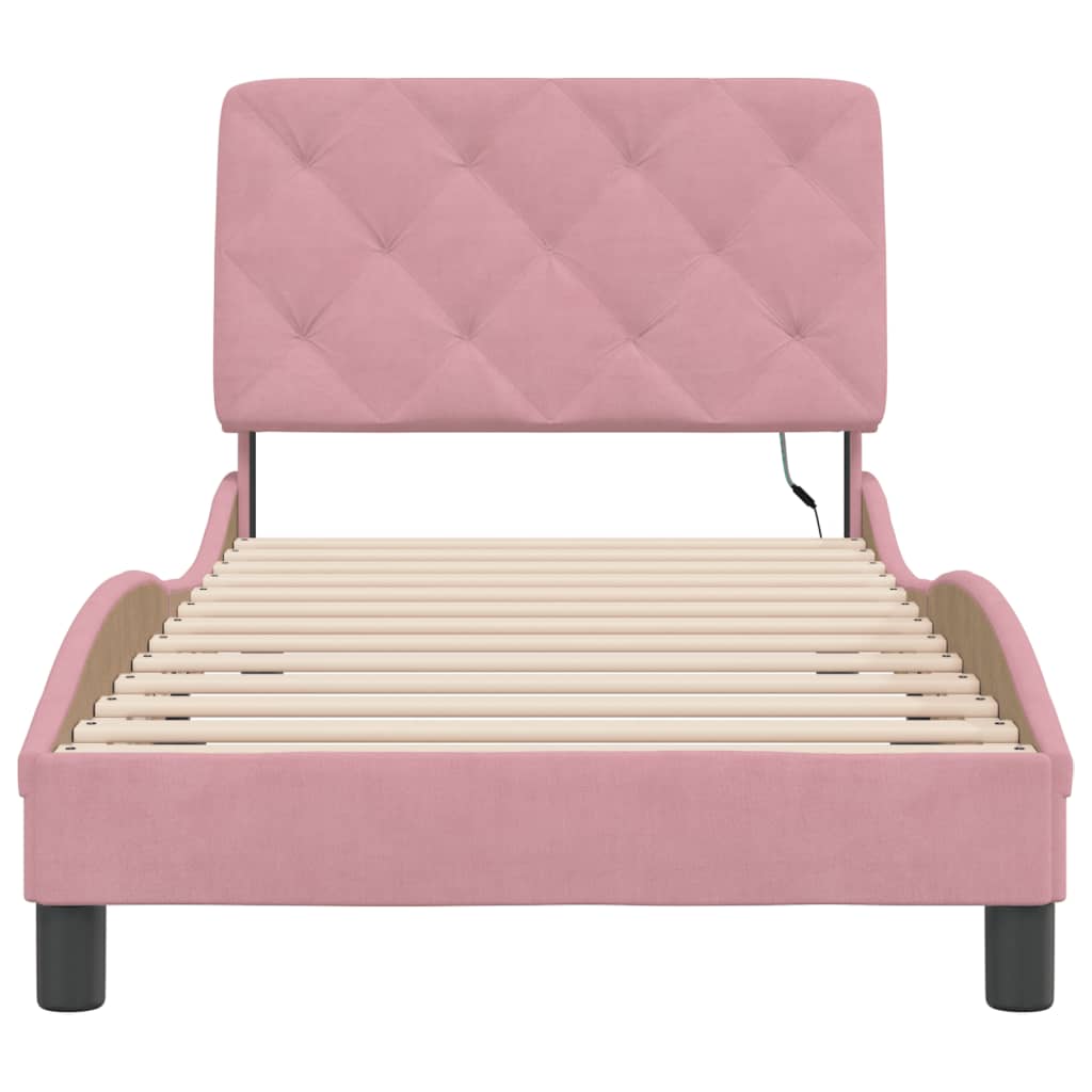 Dieses Bettgestell mit LED-Leuchten sorgt für eine erholsame Nachtruhe! Es stellt eine einladende Ergänzung zu jedem Schlafzimmer dar. Weicher Samt: Samt ist ein weicher und bequemer Stoff, der sich angenehm auf der Haut anfühlt. Sperrholzlatten: Die Sperrholzlatten sorgen für eine gute Gewichtsverteilung und auch dafür, dass die Matratze bei jeder Bewegung deines Körpers während des Schlafes an Ort und Stelle bleibt. Ausgezeichnete Unterstützung: Das Kopfteil-Kissen ist mit Schaumstoff gefüllt und fühlt sich daher extra weich und komfortabel an. Es bietet eine ausgezeichnete Rückenunterstützung beim Sitzen im Bett oder Fernsehen. Bunter LED-Streifen: Die farbenfrohen LED-Leuchten bringen das Schlafzimmer zum Leuchten! Die Klettverschlüsse auf der Rückseite des Kopfteils können zur Befestigung der LED-Leuchten verwendet werden. Wellenförmiges Seitendesign: Das stilvolle und raffinierte Design in Wellenform verleiht deiner Einrichtung eine moderne und elegante Note und macht das Bettgestell zum Mittelpunkt deines Schlafzimmers. Gut zu wissen:Bei diesem Bett ist keine Matratze im Lieferumfang enthalten. Wir bieten jedoch eine große Auswahl an Matratzen an. Du kannst in unserem Shop nach einer passenden Matratze suchen.Das Produkt verfügt über einen USB-Anschluss, für den eine zertifizierte 5V-USB-Stromquelle erforderlich ist (nicht im Lieferumfang enthalten).