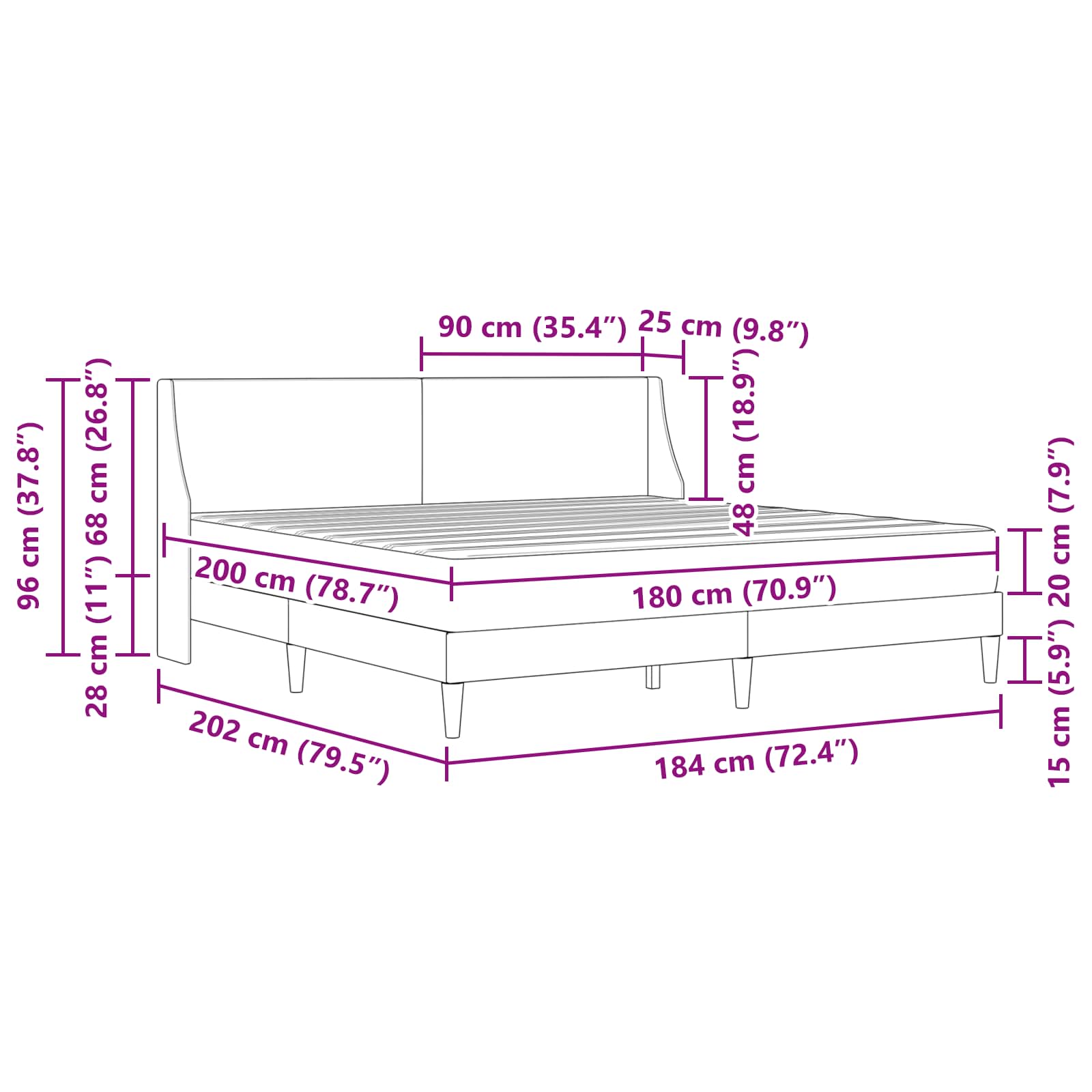 - 1 x Bettgestell mit Kopfteil: 202 x 184 x 96 cm (LxBxH)