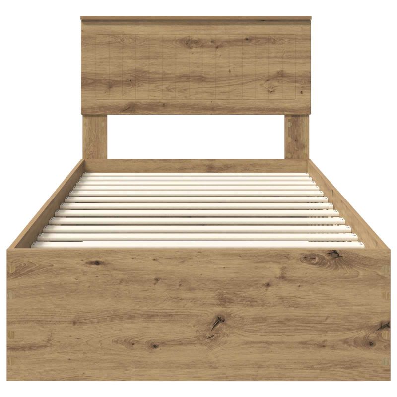 Dieses moderne Bettgestell mit Stauraum bringt frischen Wind in dein Schlafzimmer. Es kombiniert Stil und Funktionalität auf eine super elegante Art. Das schlichte Design mit seinen klaren Linien und minimalistischen Formen passt perfekt zu jedem modernen Einrichtungsstil und macht es zu einer flexiblen Wahl für jedes Schlafzimmer. Konstruierte Holzwerkstoffbauweise Das Bettgestell aus hochwertigem engineered wood ist stabil und langlebig. Das Material wurde wegen seiner Widerstandsfähigkeit gewählt, sodass du lange Freude daran hast. Es bietet die perfekte Mischung aus Stil und Funktionalität, die auch über die Jahre frisch bleibt. Integrierte Stauraumlösungen Das Bett hat praktischen Stauraum, ideal für Bettwäsche, Kleidung oder persönliche Dinge, die ordentlich verstaut werden. So wird der Platz im Schlafzimmer optimal genutzt und es eignet sich super für kleinere Räume. Modernes Kopfteil Das Kopfteil aus engineered wood ergänzt das Design und verleiht dem Bett einen coolen Look. Es ist bequem, egal ob du liegst und liest oder entspannt, und erhöht den Komfort und die Funktionalität. Effizientes Design Mit einer Höhe von 32 cm ist dieses Bett einfach zu montieren und zu reinigen. Es benötigt nur einen Schraubendreher und zwei Personen, was den Aufbau einfach und schnell macht. Einfache Wartung Die Pflege des Bettgestells ist durch die abwischbare Oberfläche aus engineered wood super easy. Ein feuchtes Tuch reicht aus, um es sauber zu halten, sodass das Bettgestell immer gut aussieht.