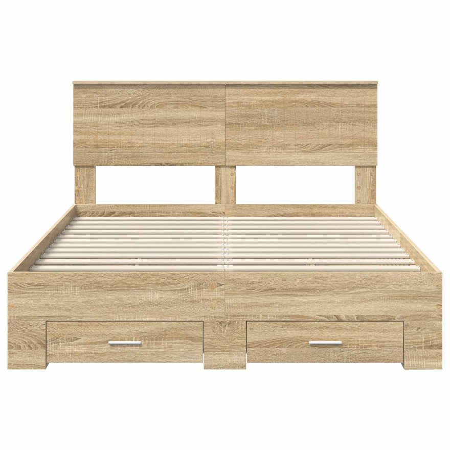 Dieses moderne Bettgestell mit Stauraum bringt frischen Wind in dein Schlafzimmer. Es kombiniert Stil und Funktionalität auf eine super elegante Art. Das schlichte Design mit seinen klaren Linien und minimalistischen Formen passt perfekt zu jedem modernen Einrichtungsstil und macht es zu einer flexiblen Wahl für jedes Schlafzimmer. Konstruierte Holzwerkstoffbauweise Das Bettgestell aus hochwertigem engineered wood ist stabil und langlebig. Das Material wurde wegen seiner Widerstandsfähigkeit gewählt, sodass du lange Freude daran hast. Es bietet die perfekte Mischung aus Stil und Funktionalität, die auch über die Jahre frisch bleibt. Integrierte Stauraumlösungen Das Bett hat praktischen Stauraum, ideal für Bettwäsche, Kleidung oder persönliche Dinge, die ordentlich verstaut werden. So wird der Platz im Schlafzimmer optimal genutzt und es eignet sich super für kleinere Räume. Modernes Kopfteil Das Kopfteil aus engineered wood ergänzt das Design und verleiht dem Bett einen coolen Look. Es ist bequem, egal ob du liegst und liest oder entspannt, und erhöht den Komfort und die Funktionalität. Effizientes Design Mit einer Höhe von 32 cm ist dieses Bett einfach zu montieren und zu reinigen. Es benötigt nur einen Schraubendreher und zwei Personen, was den Aufbau einfach und schnell macht. Einfache Wartung Die Pflege des Bettgestells ist durch die abwischbare Oberfläche aus engineered wood super easy. Ein feuchtes Tuch reicht aus, um es sauber zu halten, sodass das Bettgestell immer gut aussieht.