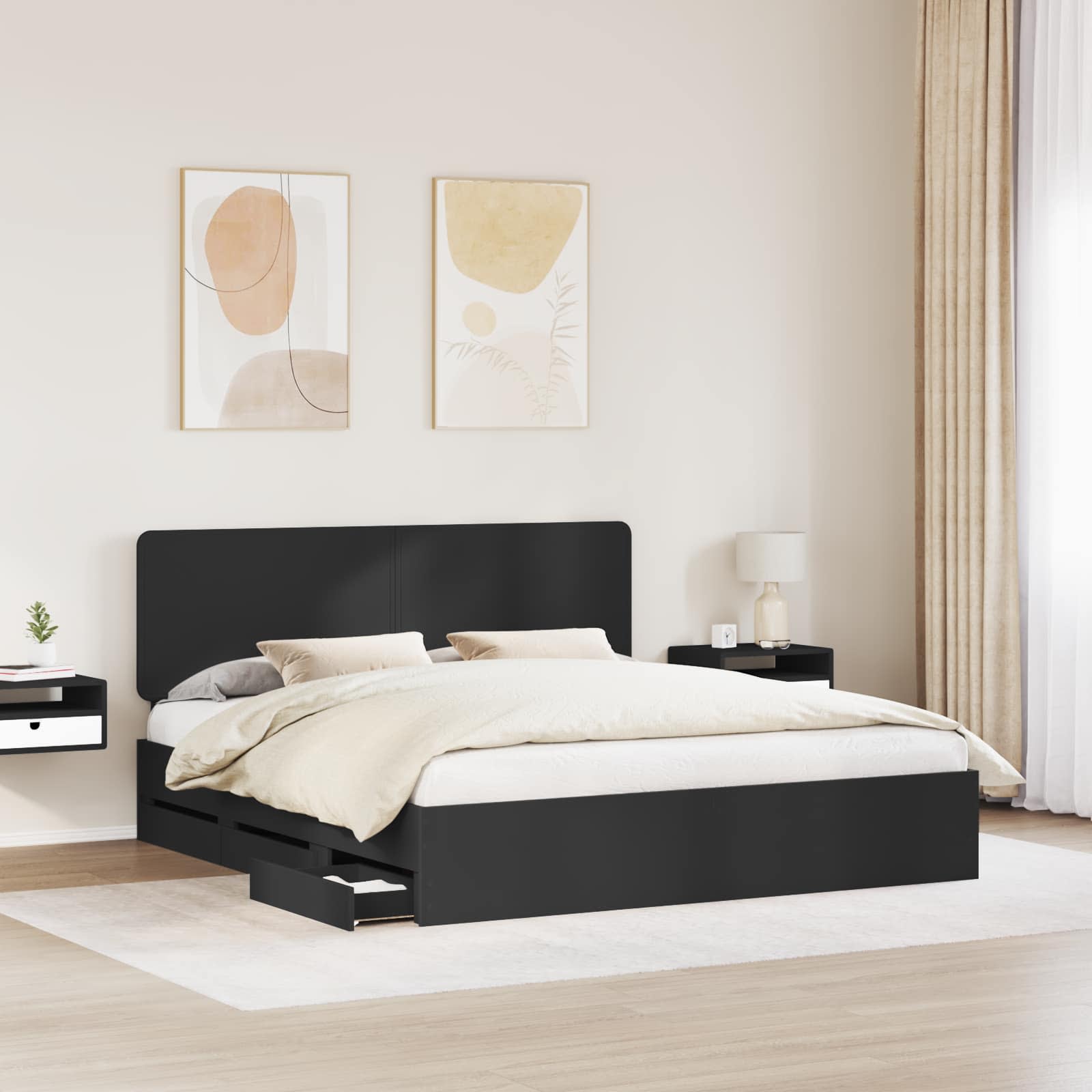 Dieses moderne Bettgestell strahlt Einfachheit und Funktionalität aus. Mit seinen klaren Linien und dem minimalistischen Design passt es perfekt in ein zeitgemäßes Schlafzimmer. Die rechteckige Form und die Komponenten aus Holzwerkstoff sorgen für einen schlichten Look. Wenn du subtilen Stil und Praktikabilität schätzt, wird dieses Bettgestell die Ästhetik deines Schlafzimmers mit seinem modernen Design aufwerten. Holzwerkstoff-Konstruktion: Das Bettgestell aus Holzwerkstoff ist stark und langlebig, was es zu einer zuverlässigen Wahl für deine Wohnung macht. Das Material ist abriebfest und sorgt für eine langanhaltende optische Anziehung, egal ob in belebten Bereichen oder ruhigen Schlafzonen. Versteckter Schubladenstauraum: Die versteckte Schublade nutzt den Platz im Schlafzimmer optimal aus und bietet praktische, diskrete Aufbewahrungsmöglichkeiten. So bleibt alles ordentlich und sorgt für eine aufgeräumte Atmosphäre. Robuster Lattenrahmen: Mit einem stabilen Lattenrahmen unterstützt das Bett verschiedene Matratzenarten. Dieses Design sorgt für eine komfortable Liegefläche und kombiniert Stabilität mit modernem Stil. Einfache Montage mit beiliegenden Werkzeugen: Mit dem Bettgestell ist die Montage kinderleicht und benötigt nur zwei Personen mit einem Schraubendreher. Alle erforderlichen Teile sind enthalten, damit alles reibungslos funktioniert - ohne Stress durch fehlende Werkzeuge. Minimale Pflege: Die Pflege des Bettgestells ist simpel - einfach mit einem feuchten Tuch abwischen. So wird es immer schön sauber und trägt zur schlichten Eleganz des Designs bei.